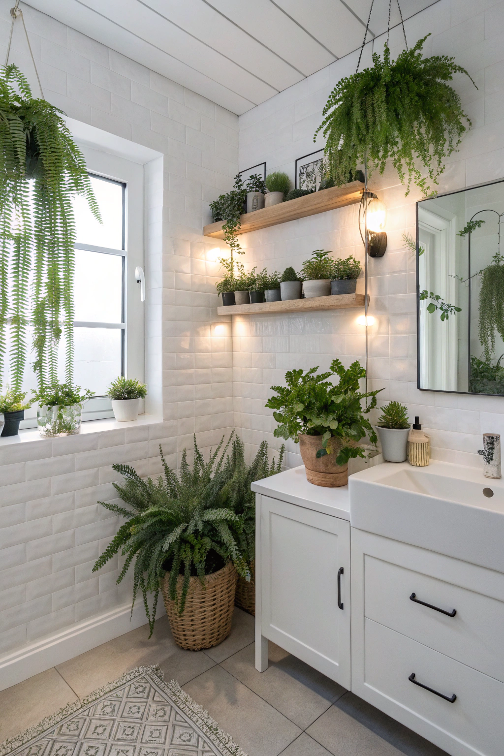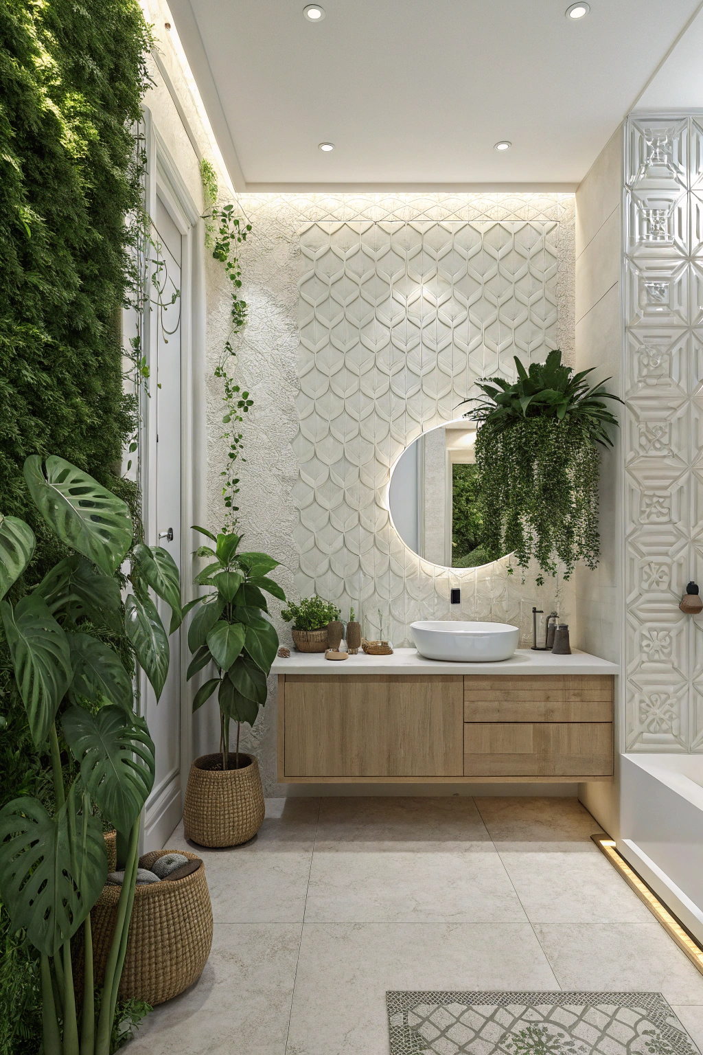 PinAfter infusing your bathroom with vibrant greenery, consider adding textured white wallpaper to elevate the sophistication of your space. Choose designs like subtle geometric patterns or intricate floral motifs to create depth and visual interest.