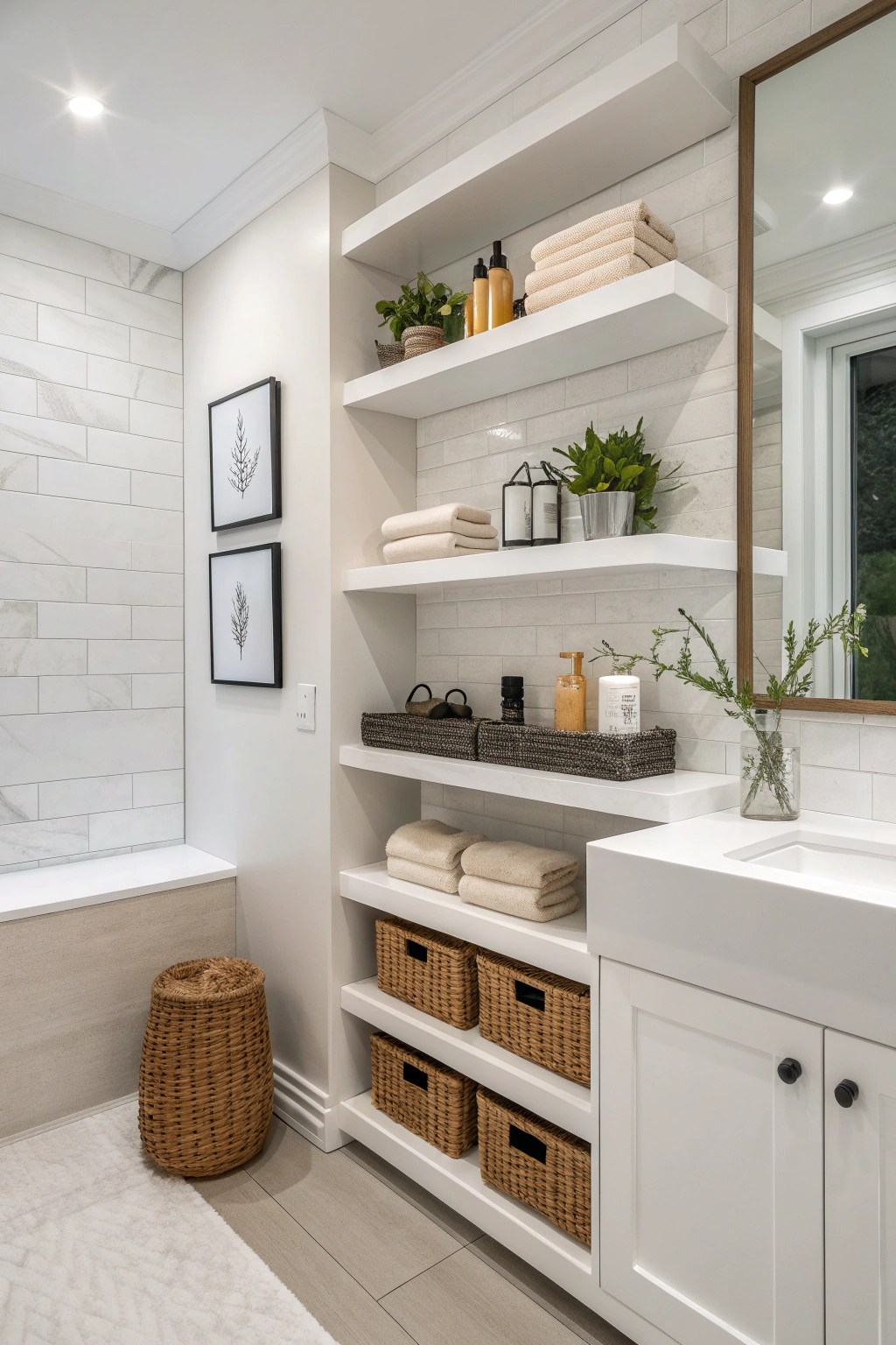 Hang a striking abstract print or a series of minimalist sketches to create a focal point. The contrast of bold lines against a white backdrop adds sophistication and depth, making your bathroom feel like a curated gallery.