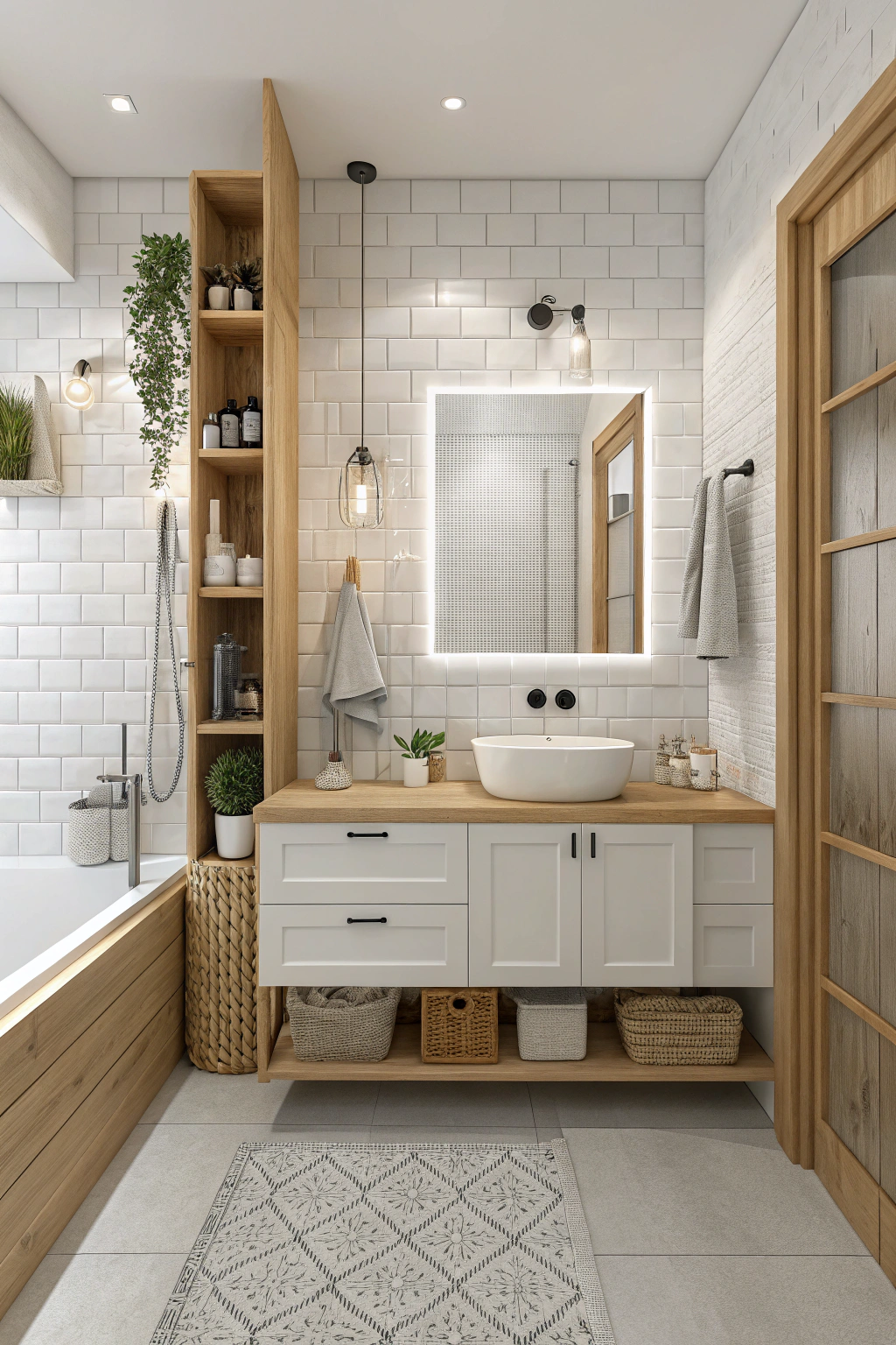 Consider if adding wood accents truly brings warmth to an all-white bathroom. You can incorporate wooden shelves, a bamboo mat, or a teak stool. These elements introduce texture and natural tones, creating a cozy, inviting atmosphere.