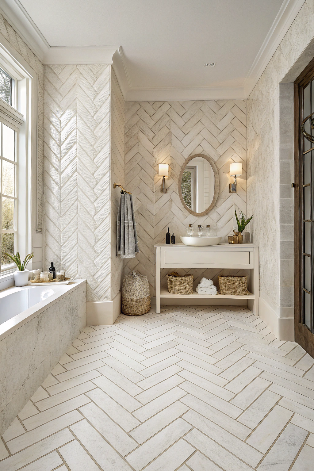 PinWhite herringbone patterns often add a touch of elegance and sophistication to your bathroom decor. By layering tiles in this classic design, you create a dynamic visual interest, enhancing the room's overall appeal. It's a versatile choice that works beautifully on floors or walls.