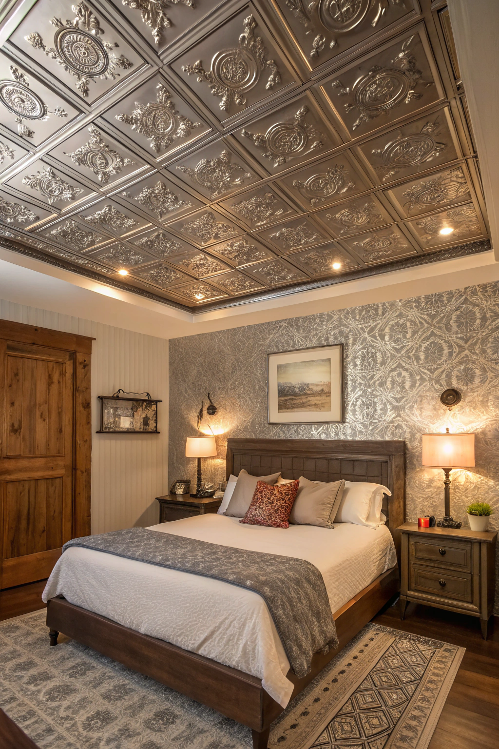 PinIf you're looking to bring a touch of nostalgia to your bedroom, vintage-inspired tin tiles can be a stunning choice. They evoke a classic charm that enriches your space while adding a unique texture. You can choose from various patterns and finishes, allowing you to customize the aesthetic. Installing these tiles in your ceiling creates an eye-catching focal point and enhances the overall ambiance.