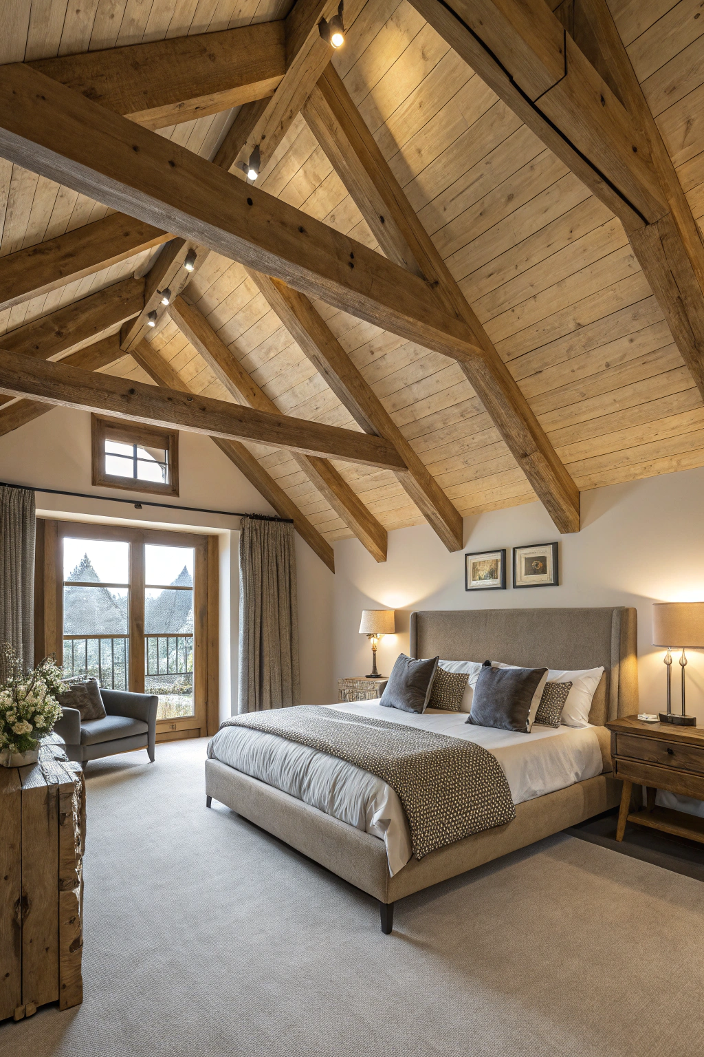 PinIncorporating wooden beams into your bedroom ceiling brings a touch of natural warmth and charm. These beams create an inviting atmosphere, enhancing your space's overall aesthetic. You can choose from rustic finishes for a cozy feel or sleek designs for a modern touch. Whichever you select, wooden beams not only improve visual appeal but also add a luxurious, earthy element to your sanctuary.
