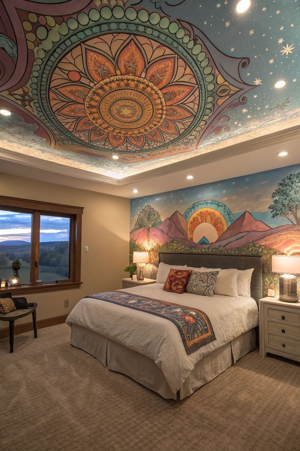 PinTransform your bedroom into a personalized sanctuary by incorporating artistic murals or graphics on the ceiling. This unique touch can elevate your space in various ways: