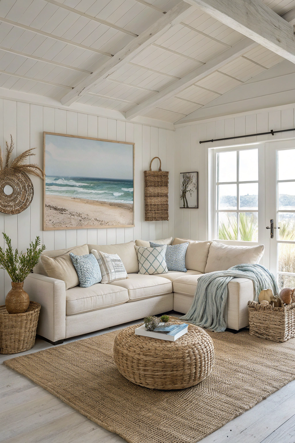 PinThe elegant coastal touch brings a revitalizing vibe to your living room, effortlessly showcasing your L shape sofa as a stylish centerpiece. To achieve this look, focus on: