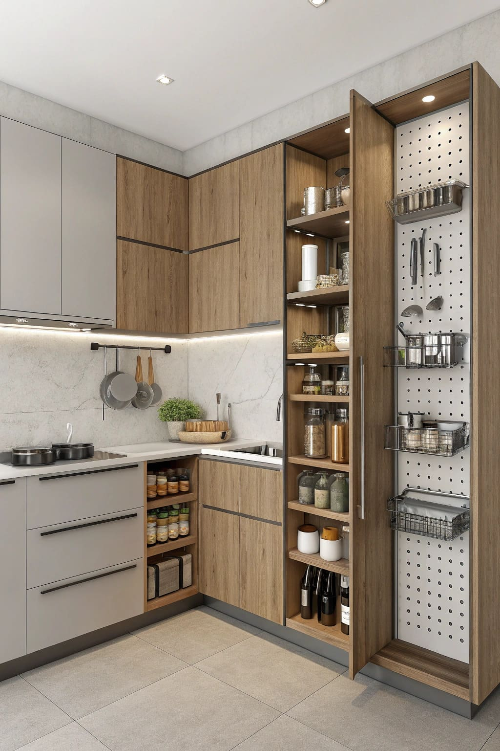 Maximizing storage in your L-shaped kitchen is essential for maintaining an organized and efficient space. Use vertical cabinets to take advantage of height and install pull-out shelves to access items easily. Consider corner units with rotating shelves to maximize awkward spaces. Magnet strips can hold knives, while a pegboard offers a stylish way to display utensils, keeping your counters clutter-free.