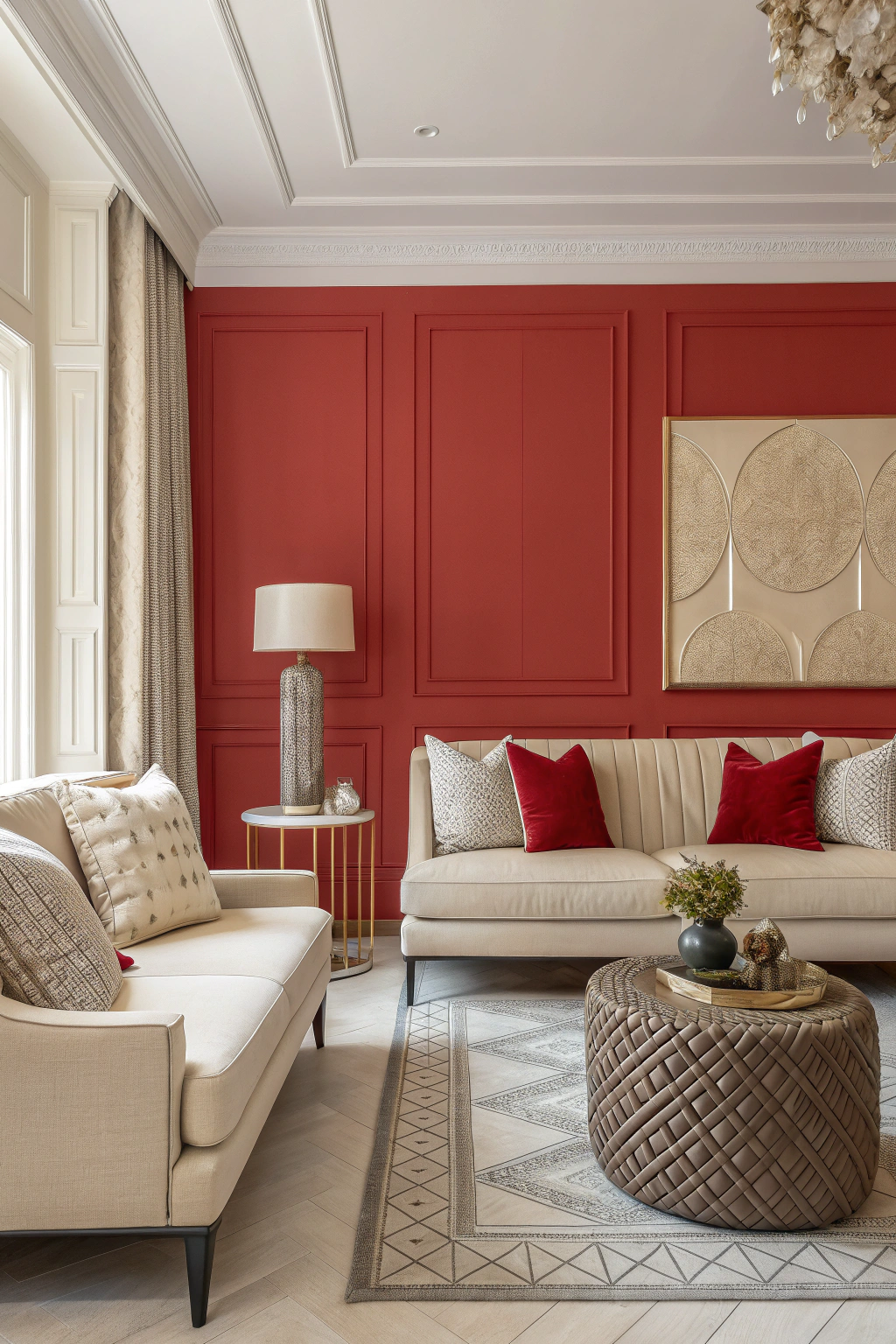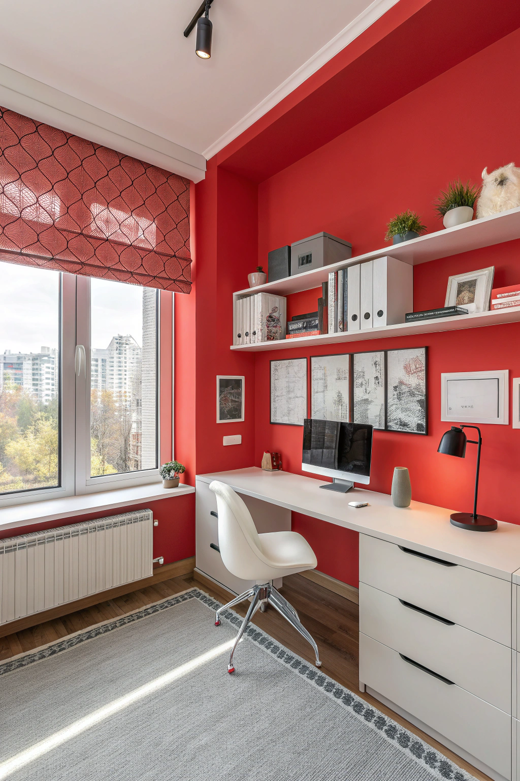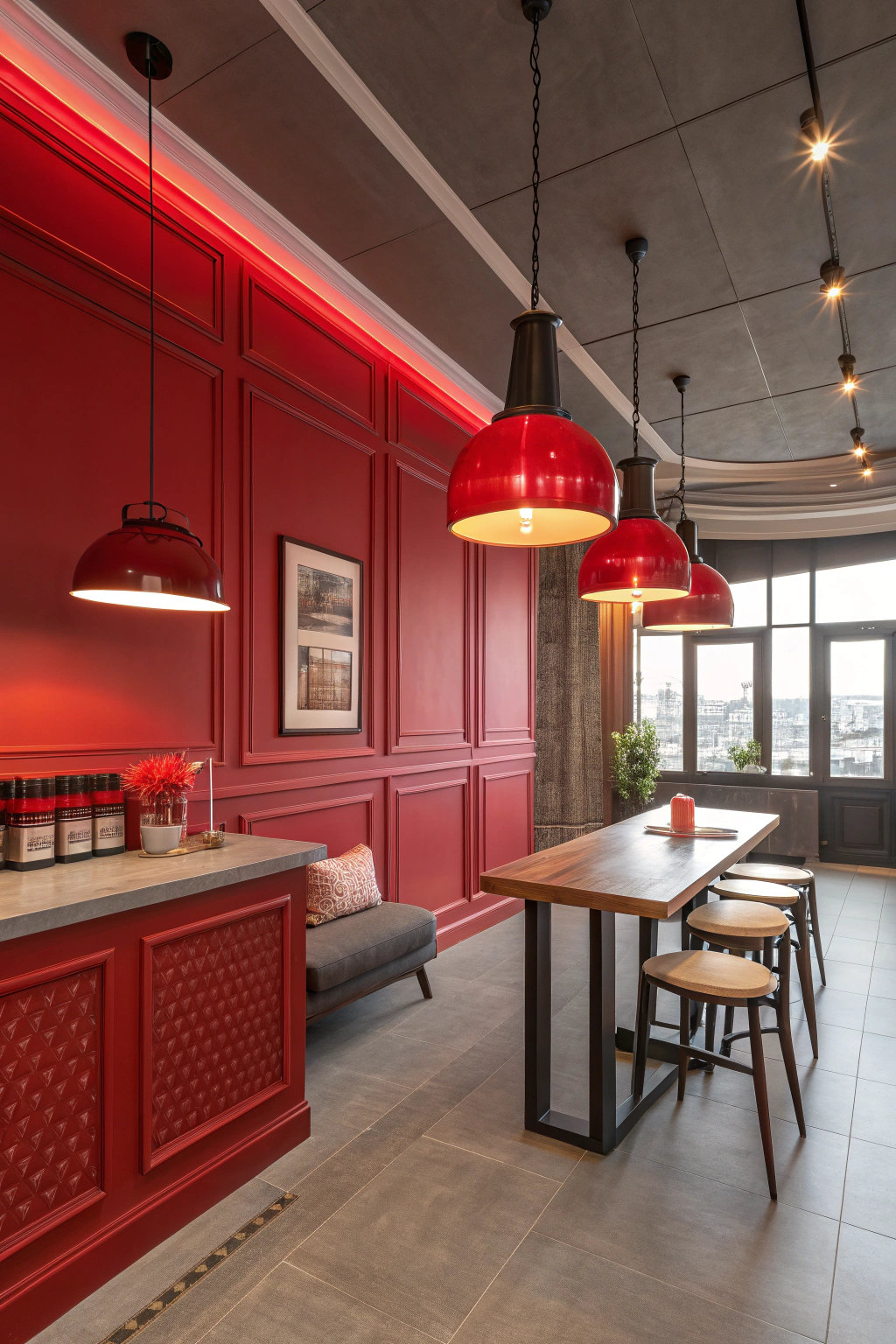 - A bold red accent wall to energize the atmosphere.