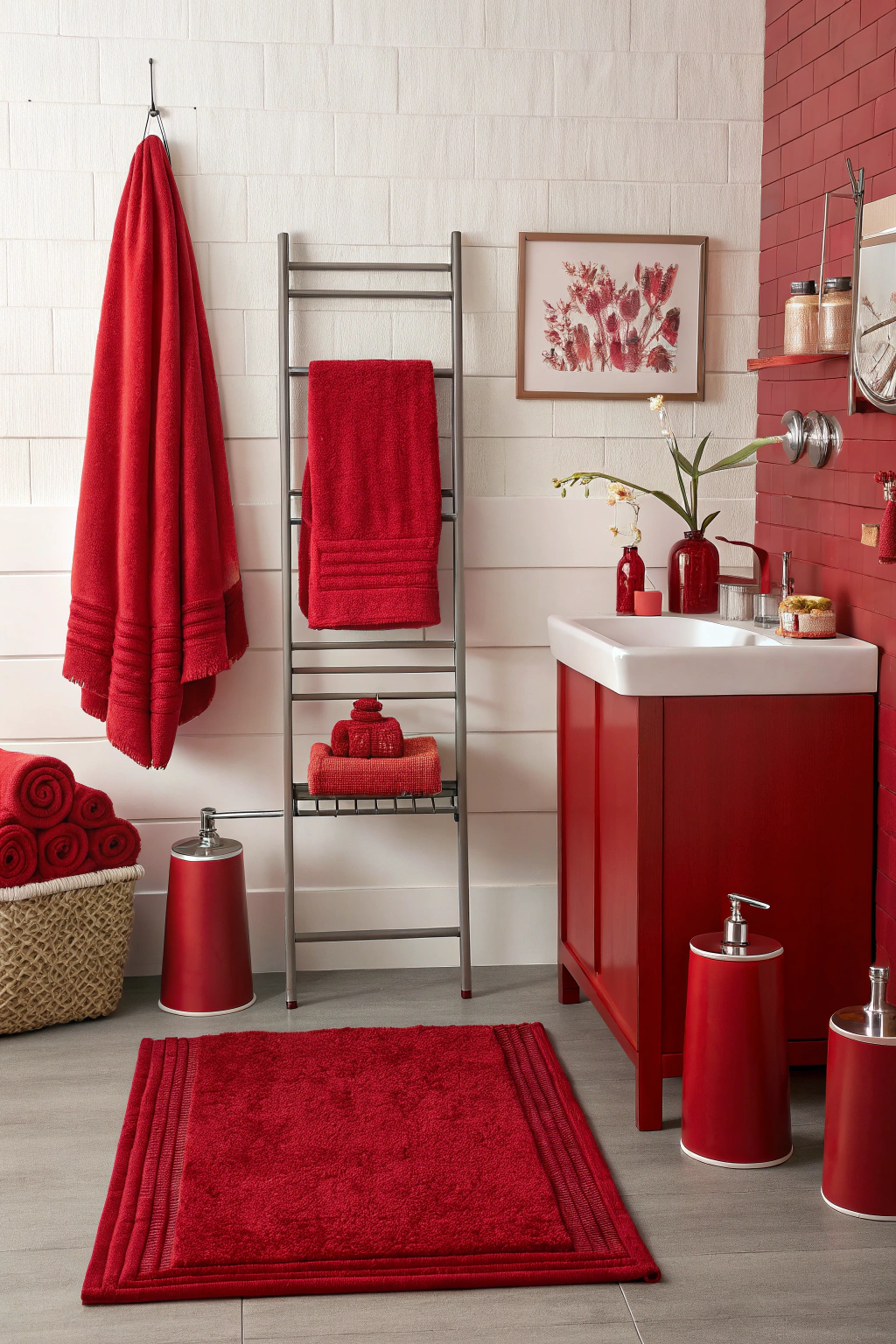 - Bold red towels for a pop of color