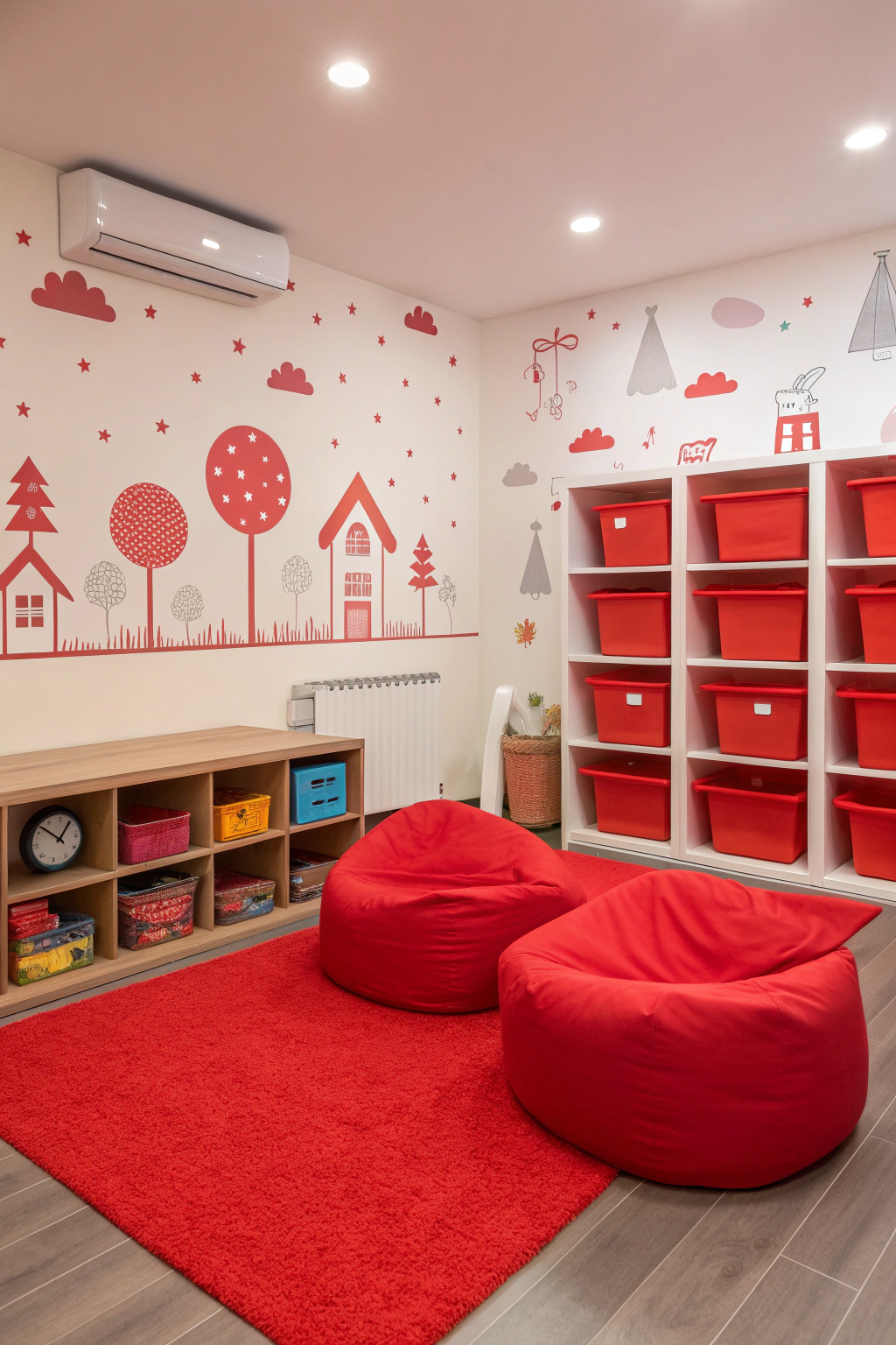 - Vibrant red rugs to define play areas