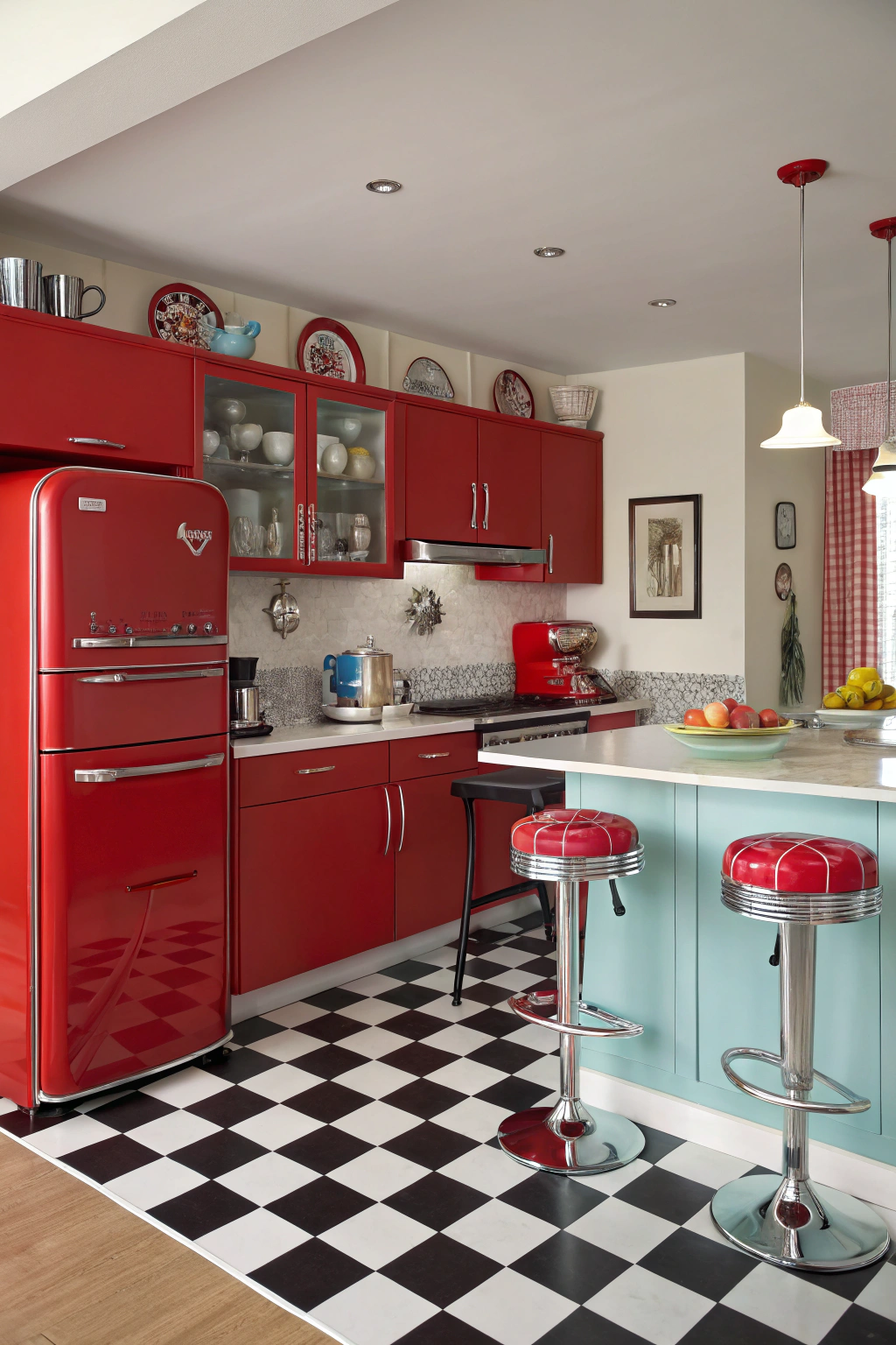 PinWhen you think of a retro kitchen, bold colors like red often come to mind. To create this vibrant look, pair cherry-red cabinetry with checkered black-and-white flooring. Incorporate vintage appliances with chrome accents for that classic feel. Don't forget to add retro bar stools and colorful dishware to complete the nostalgic vibe. With these elements, your kitchen will channel timeless charm and energy.