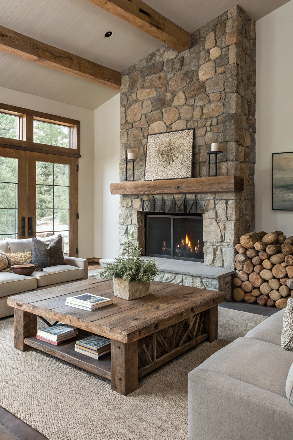 PinBringing stone accents into your living room adds a grounding element that complements the Wabi Sabi aesthetic beautifully. You might choose a rough-hewn coffee table, a stone fireplace, or decorative stone pieces. Incorporating river rocks or slate in your decor can enhance texture and warmth. These natural elements not only create visual interest but also embody imperfection, aligning perfectly with Wabi Sabi principles.