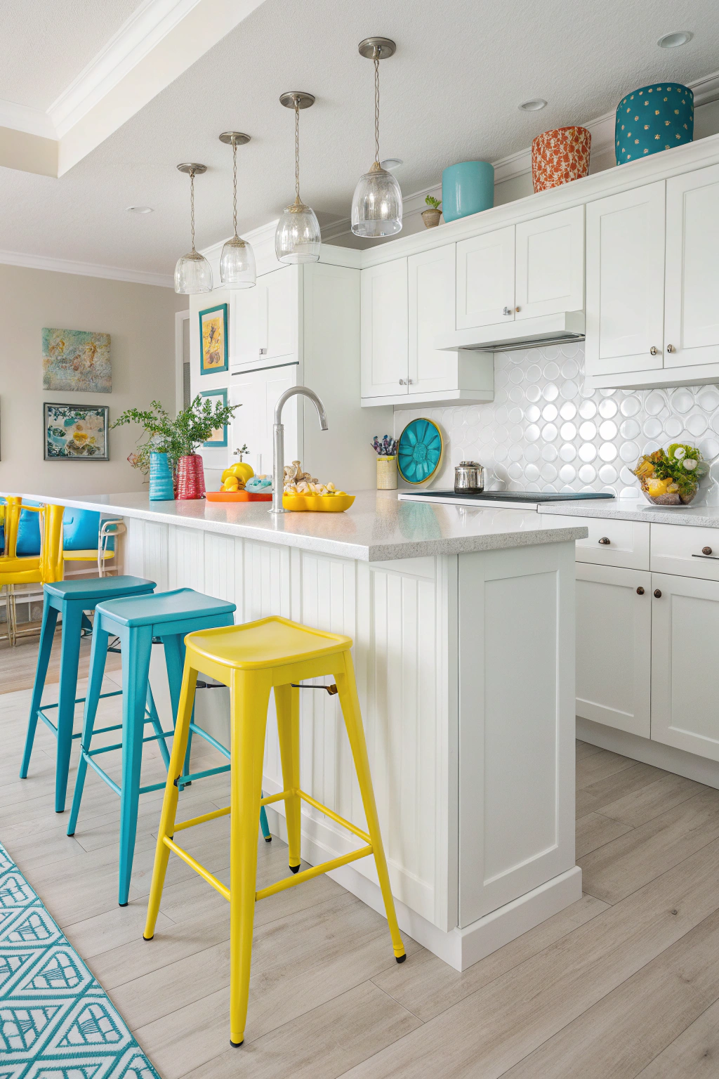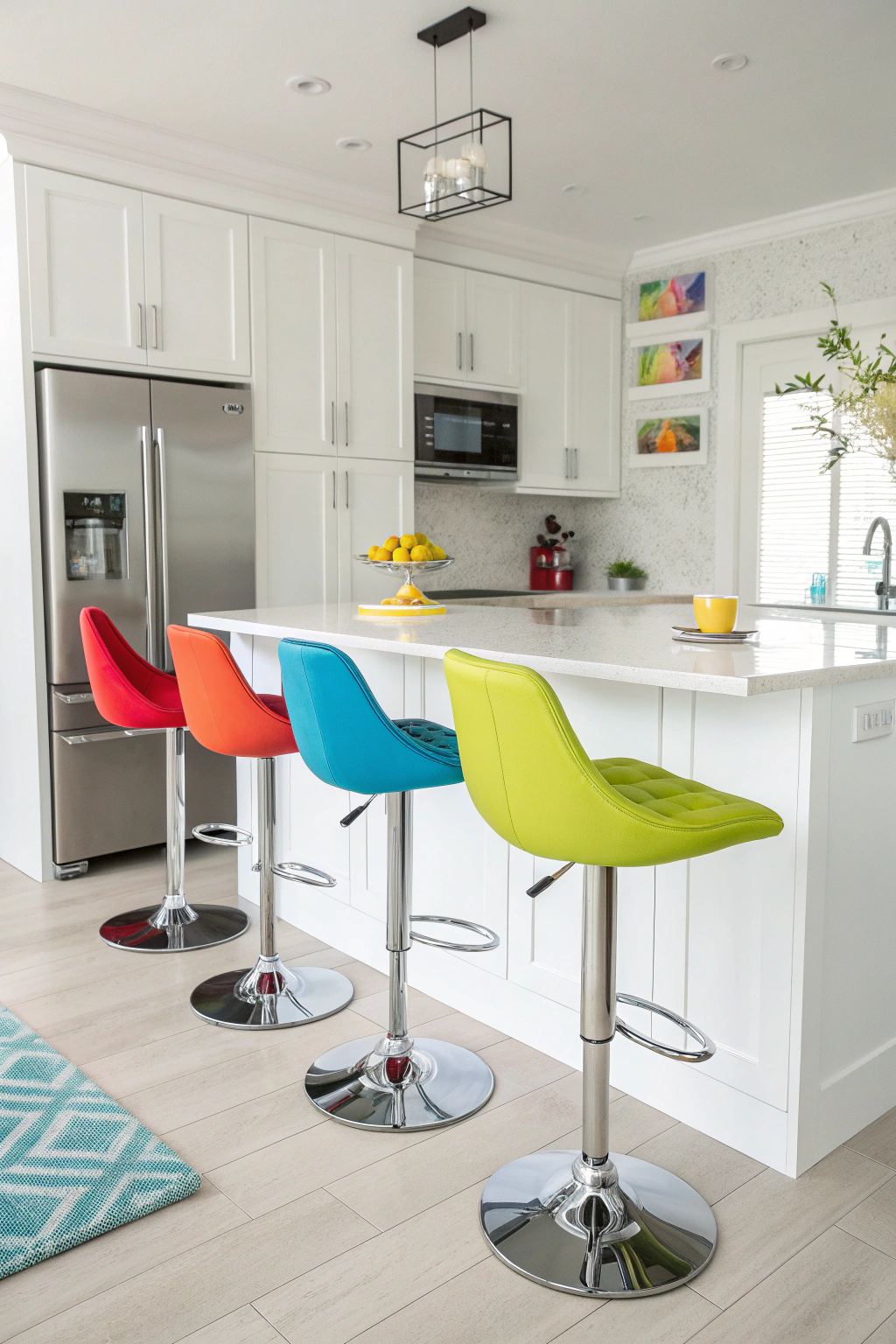 PinBright, colorful bar stools bring energy to your white kitchen, but to truly modernize the space, consider integrating technology features that enhance both functionality and style. These upgrades not only streamline your cooking experience but also elevate the aesthetic.