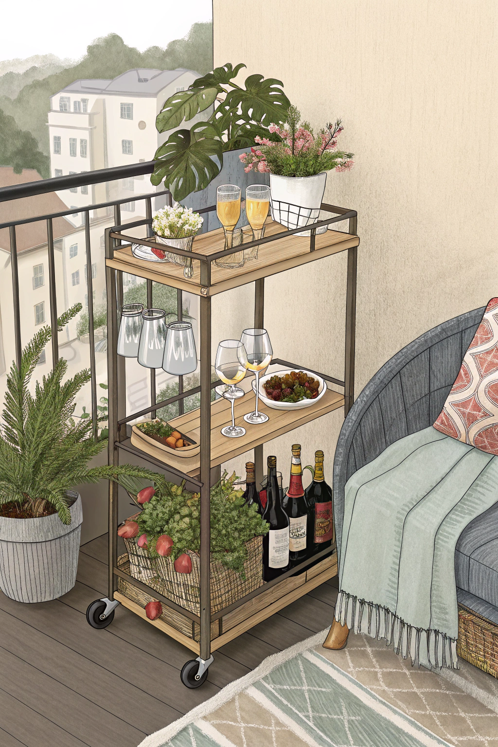PinA small bar cart can be the centerpiece of your balcony, combining functionality and style. Use it to create a cozy atmosphere and impress guests. Here are some ideas for your cart: