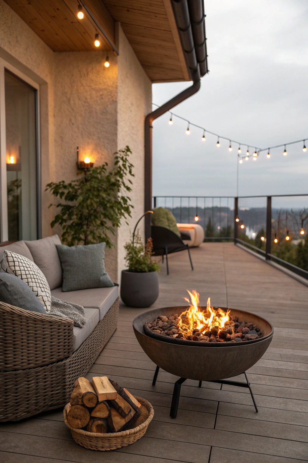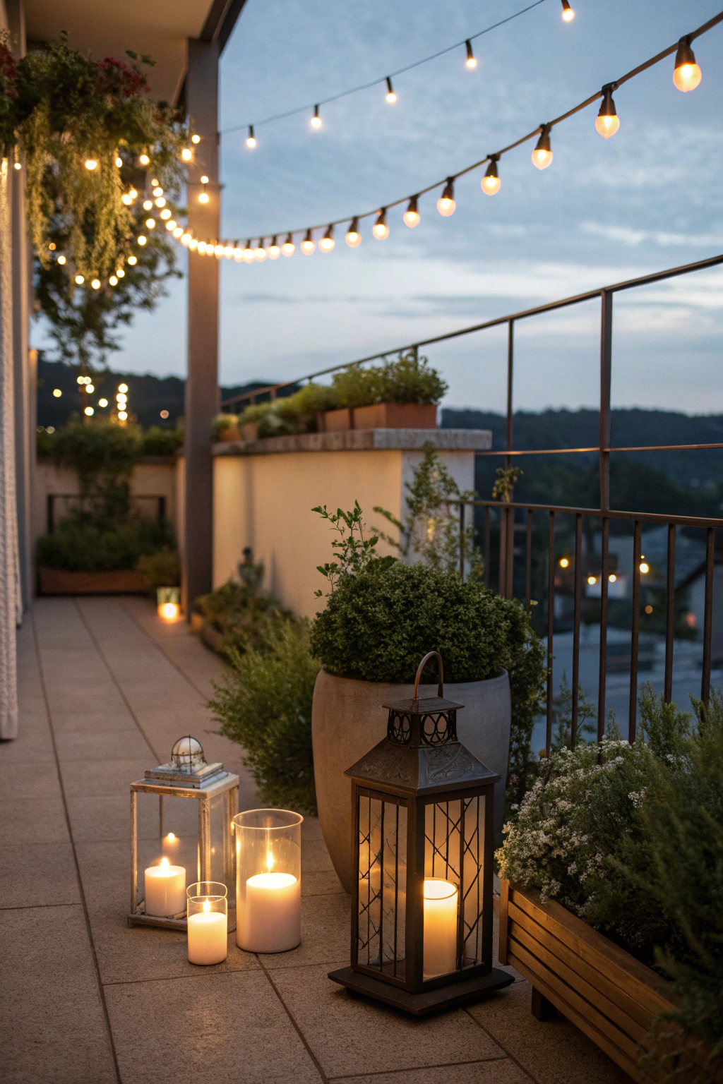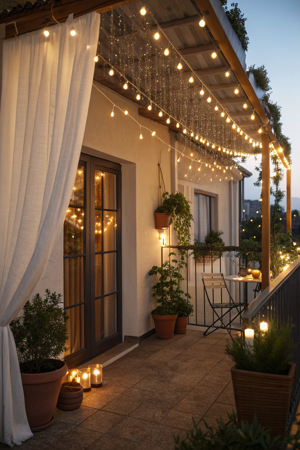 - Drape lights along the balcony railing