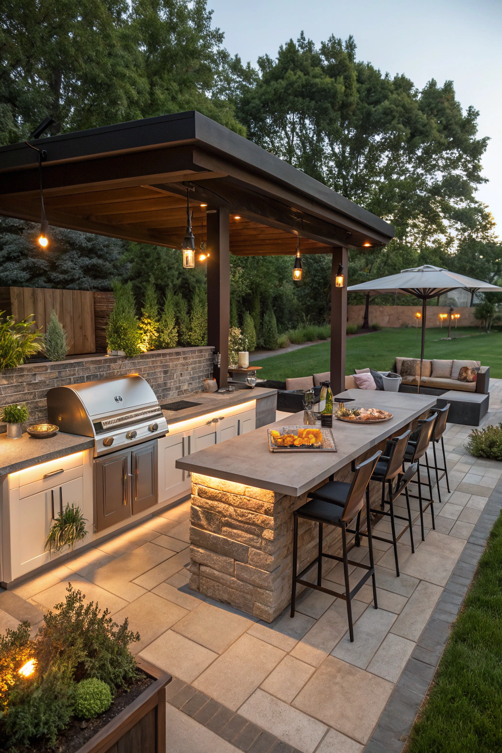 PinCreating an outdoor cooking area transforms your backyard into a vibrant gathering space for family and friends. You can install a grill, countertops, and seating to enhance your culinary experience. When choosing appliances, consider weather-resistant materials to guarantee durability. Add lighting for evening ambiance and herbs for freshness. With thoughtful design, your outdoor space becomes an inviting spot for meal preparation and socializing.