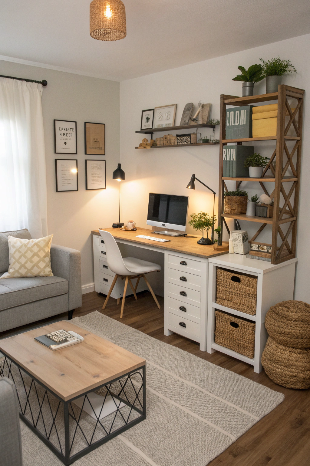 PinHow can you create a functional living room that doubles as an efficient workspace? Start by choosing a compact desk that blends with your dΓ©cor. Utilize multi-functional furniture and designate a specific work zone. Good lighting is essential, so consider adding a stylish lamp. Keep it organized with smart storage solutions to minimize clutter.