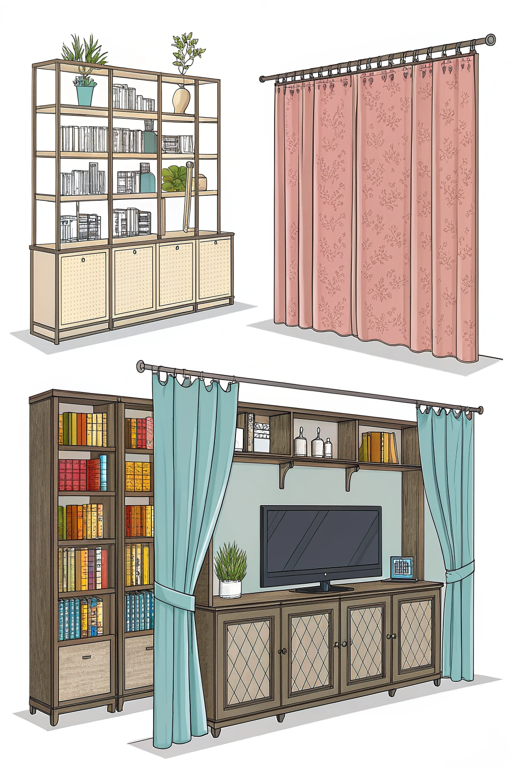 - Curtains: Add softness and divide areas.