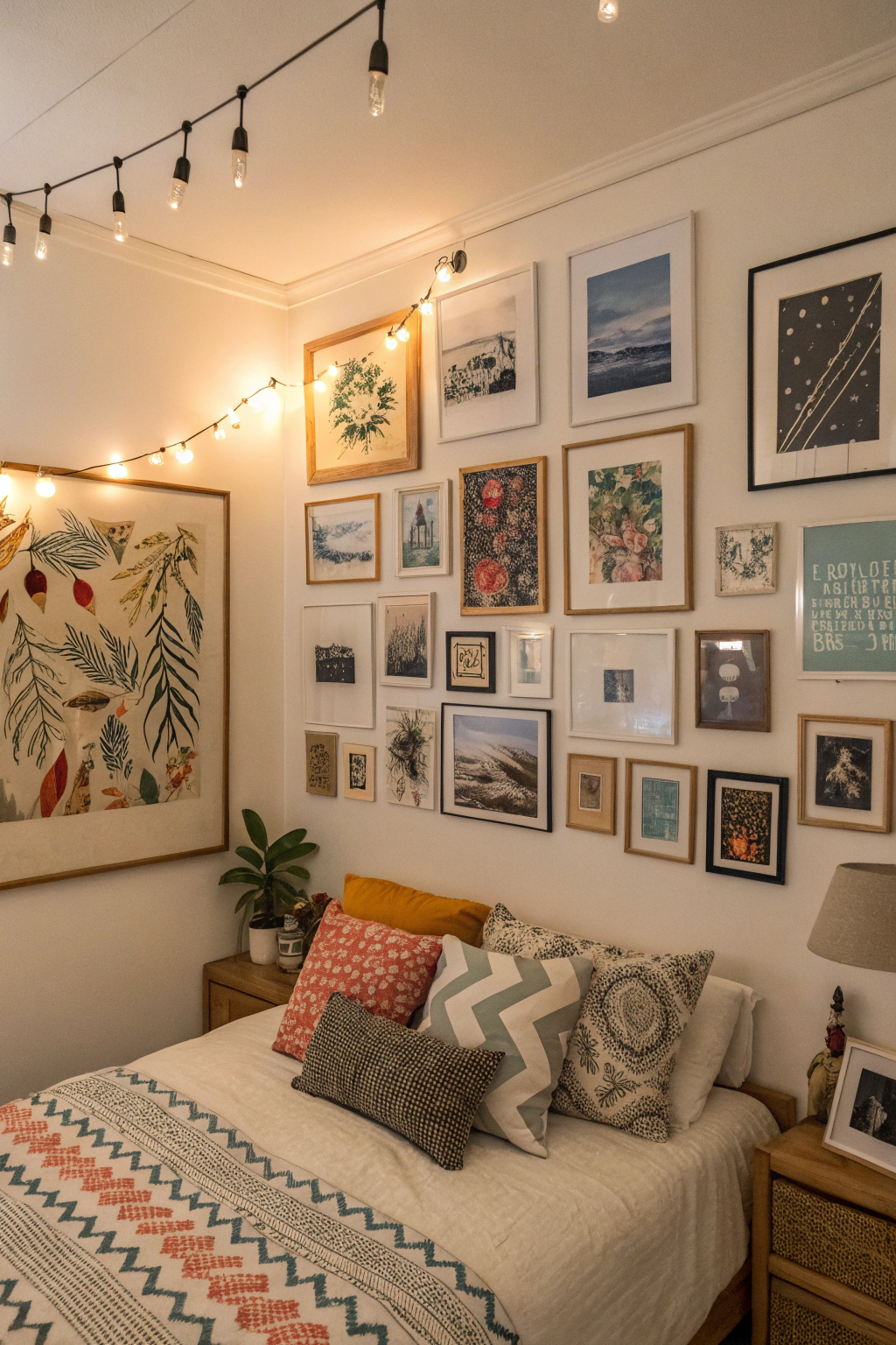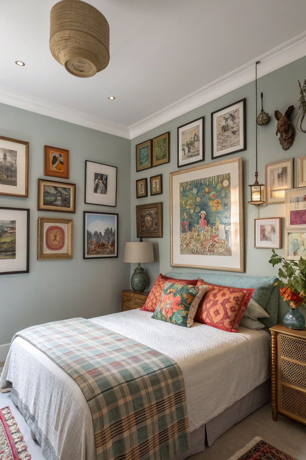 PinA gallery wall can frequently transform a small bedroom into a personalized haven filled with character. Choose a mix of artwork, photographs, and prints that resonate with you. Arrange them in a grid or an eclectic style, and play with frame sizes and colors. This visual focal point not only adds interest but also makes your space feel uniquely yours.