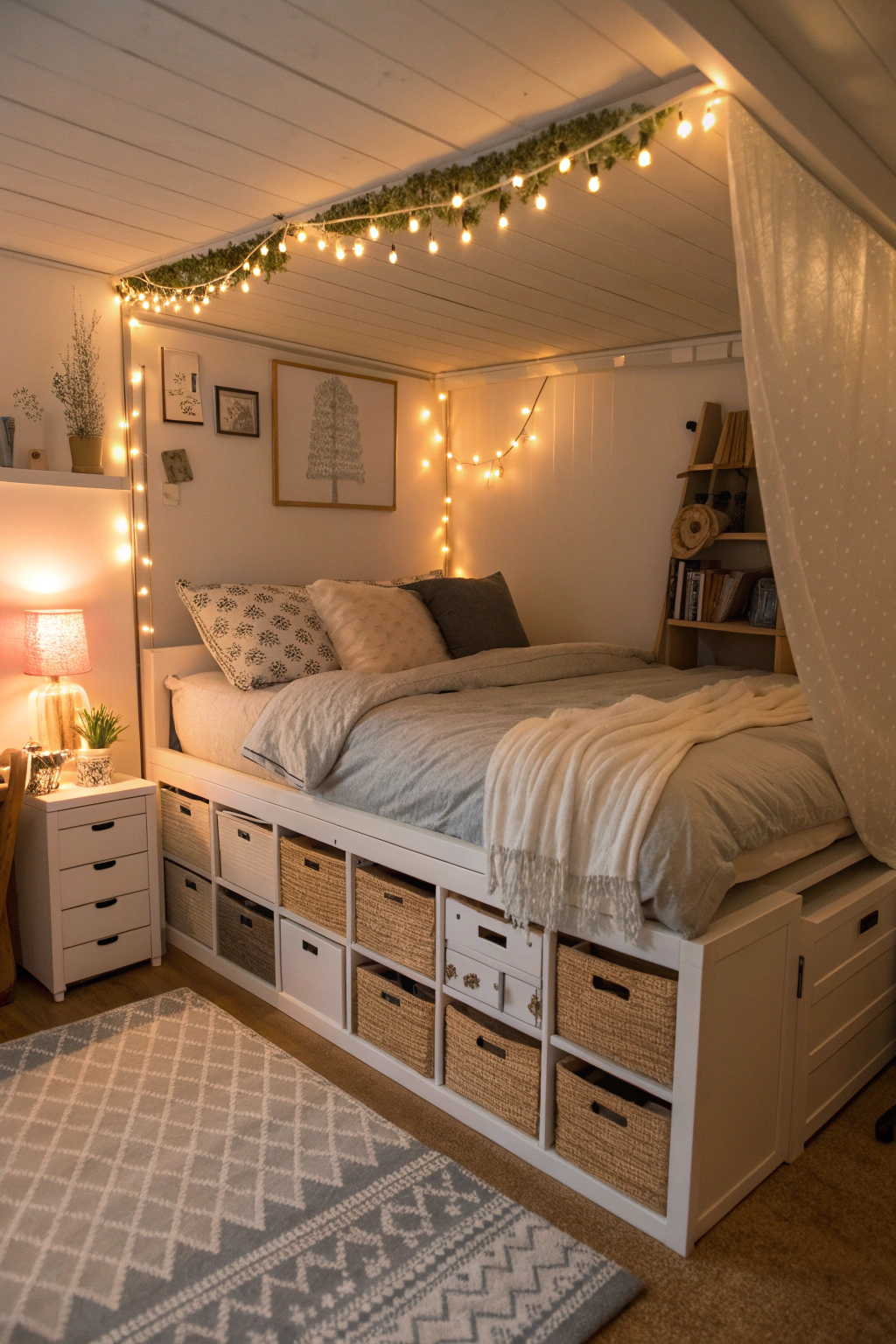 PinIncorporating under-bed storage can help you keep your small bedroom organized, but the atmosphere matters just as much. To create a cozy feel, use soft lighting. Switch out harsh overhead lights for warm lamps or string lights. Position them to cast a gentle glow, making the space inviting. Soft lighting not only enhances comfort but also visually expands your small room.