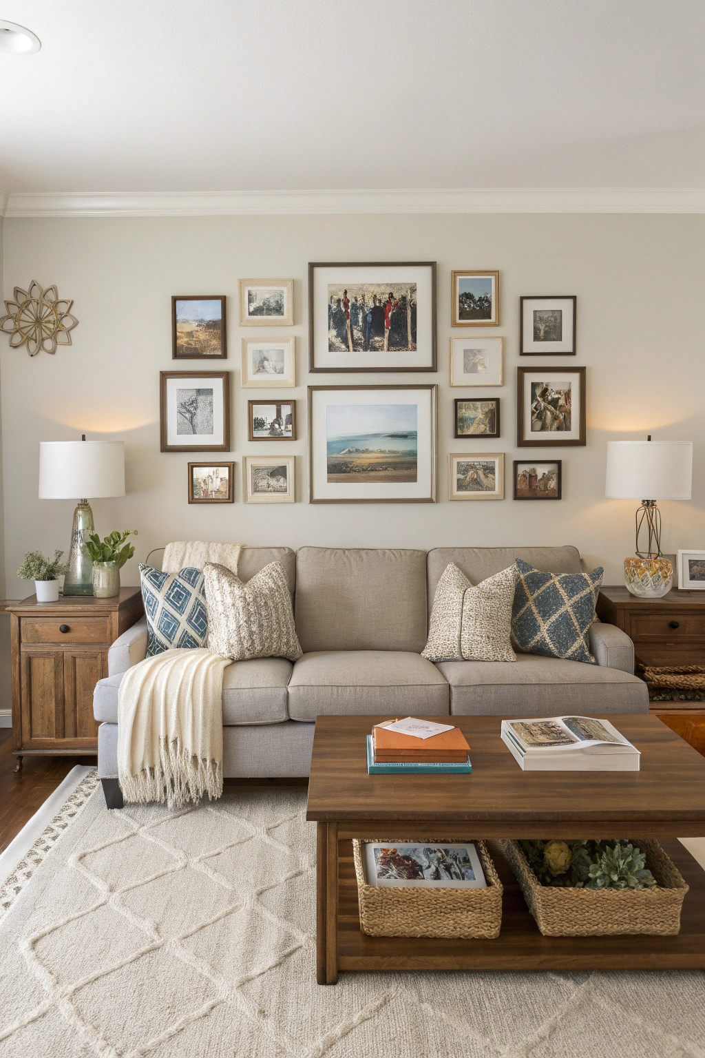 PinCreating a balanced look with symmetry sets a solid foundation, but personal touches are what truly make your living room feel like home. Add family photos in unique frames, display your favorite artwork, or incorporate travel souvenirs. Choose a few decorative items that reflect your personality, like a cozy throw blanket or stylish books. These details create warmth and invite conversation, enhancing your living space.