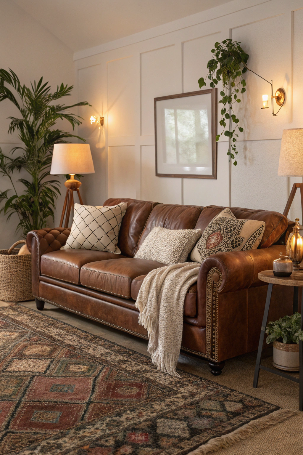 These materials create a cozy, inviting atmosphere that complements your leather couch perfectly.