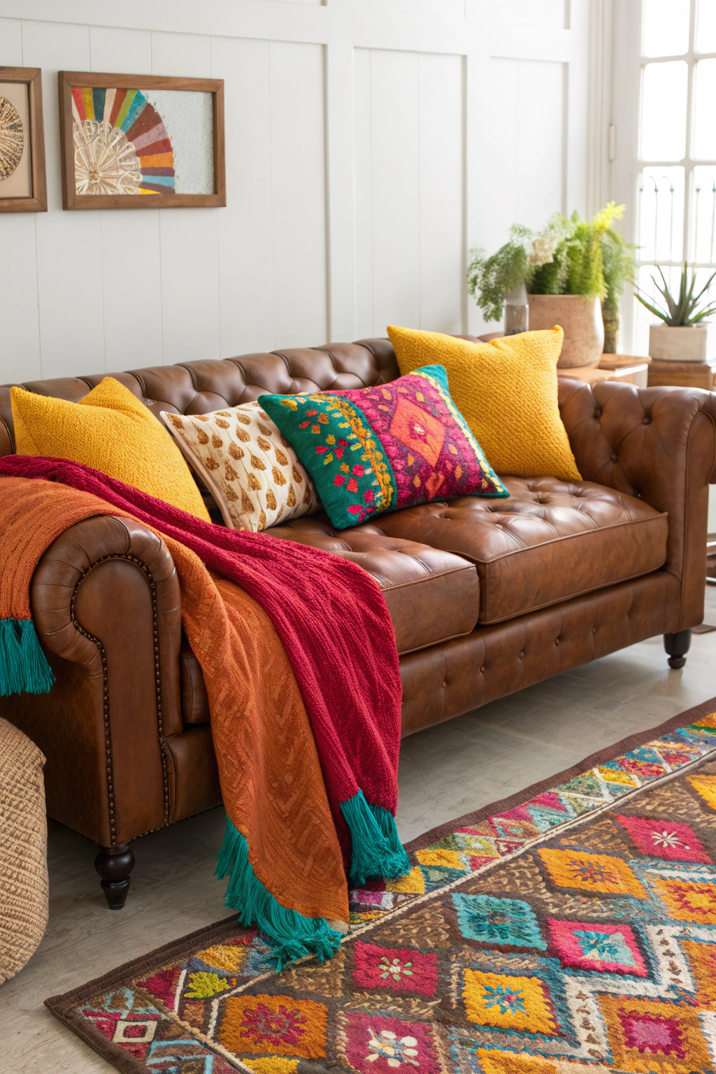 PinA few colorful pillows can transform your brown leather couch into a vibrant focal point in your living room. They add personality and can be easily swapped out with the seasons or trends. Consider these options: