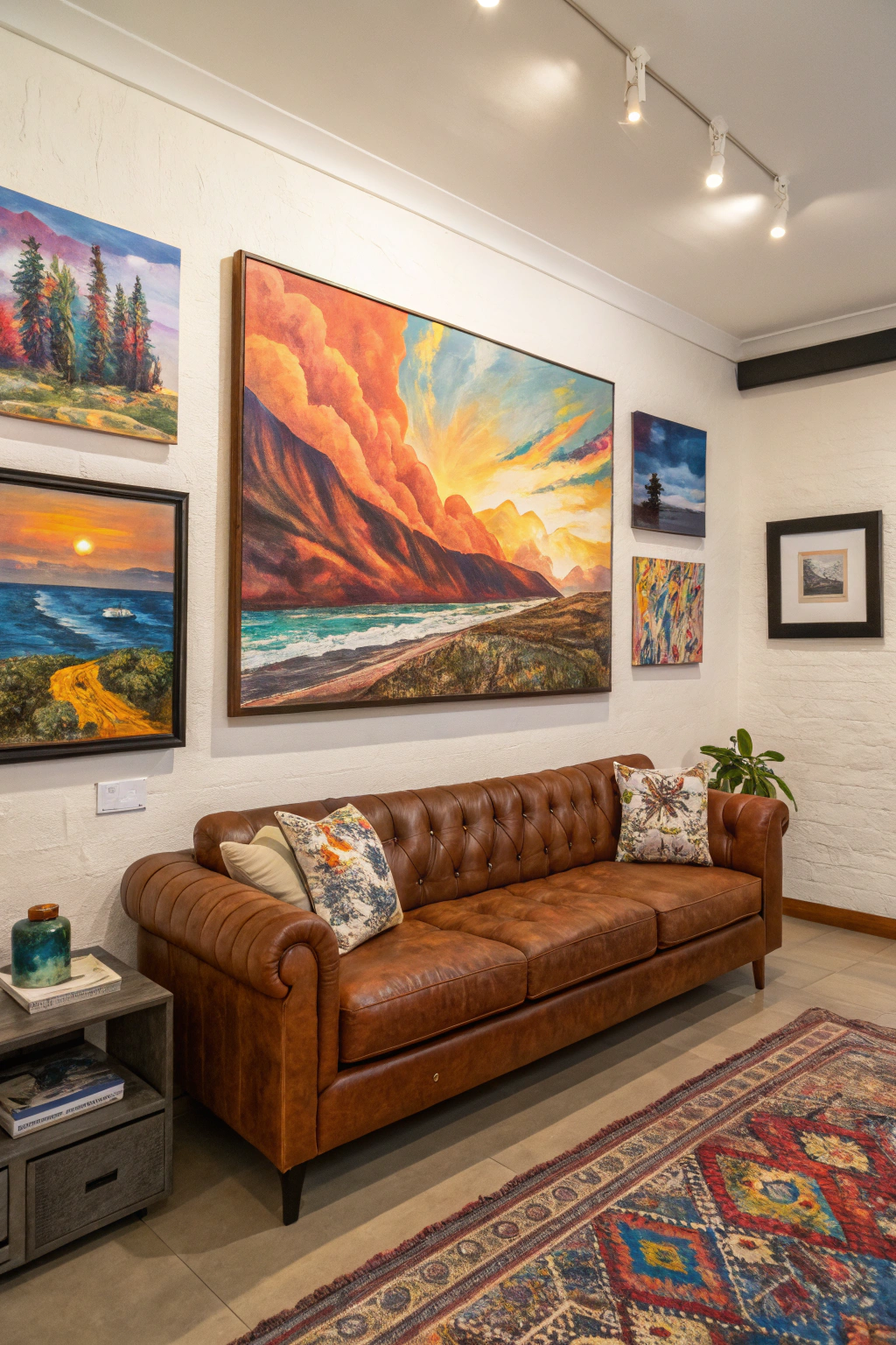PinIncorporating bold artwork into your living room not only elevates the aesthetic but also adds a personal touch that reflects your style. Choose pieces that contrast your brown leather couch, like vibrant abstract prints or colorful landscapes. Large canvases can become focal points, while smaller artworks can create an intriguing gallery wall. Don't shy away from mixing different styles to showcase your personality!