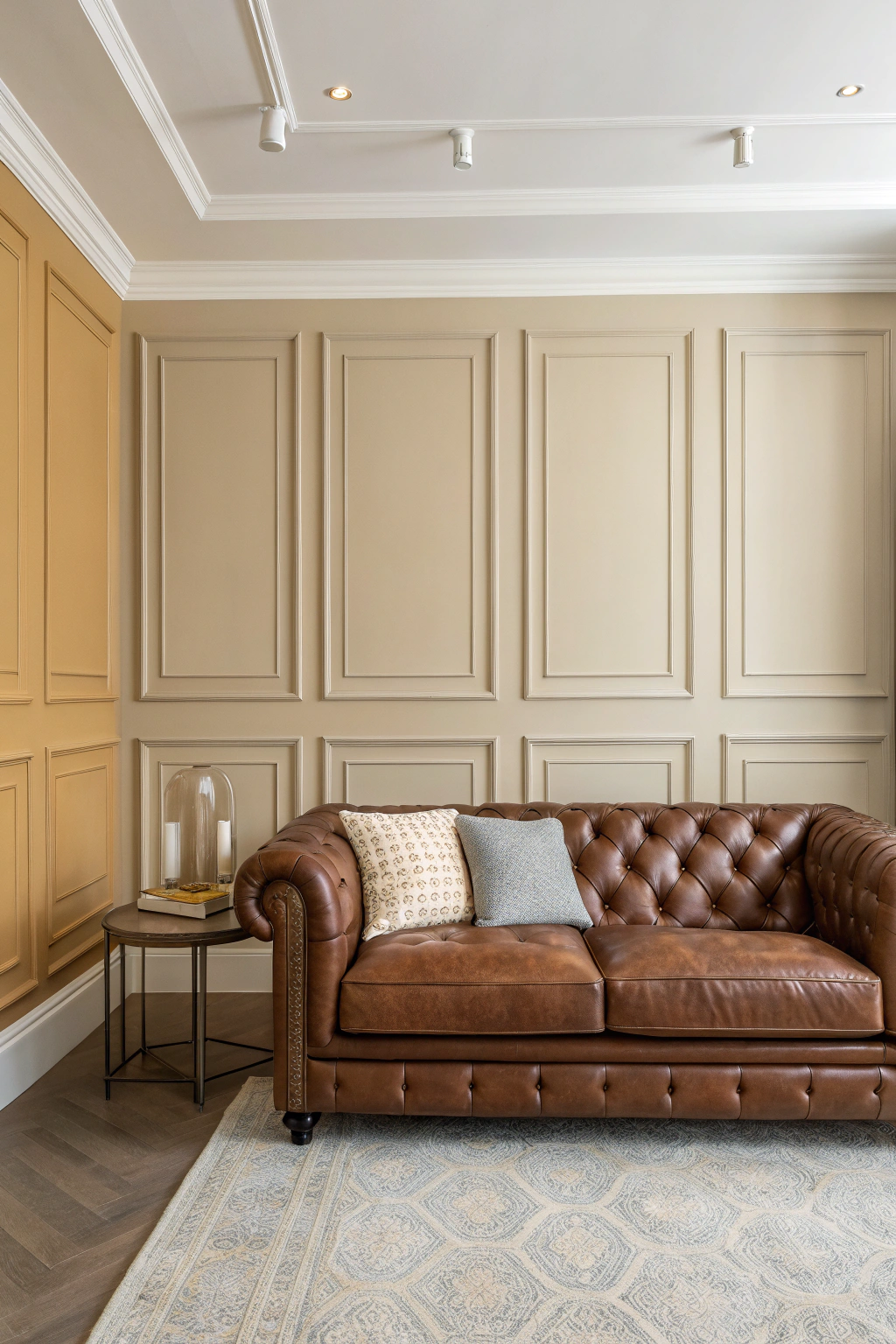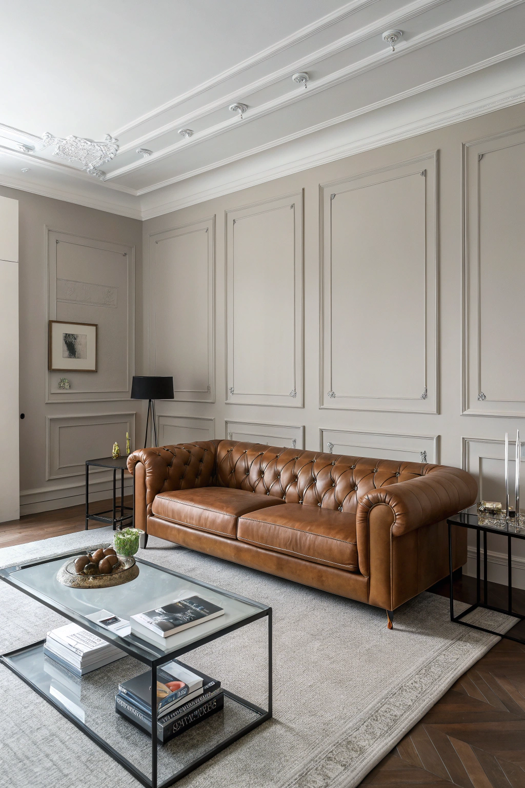 - Position your brown leather couch as a focal point.