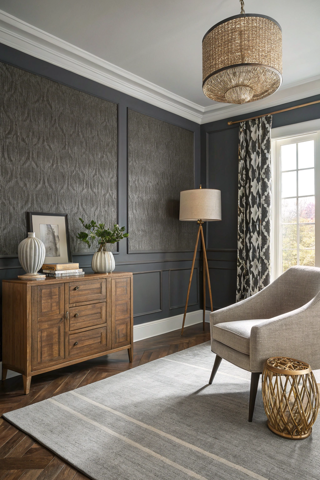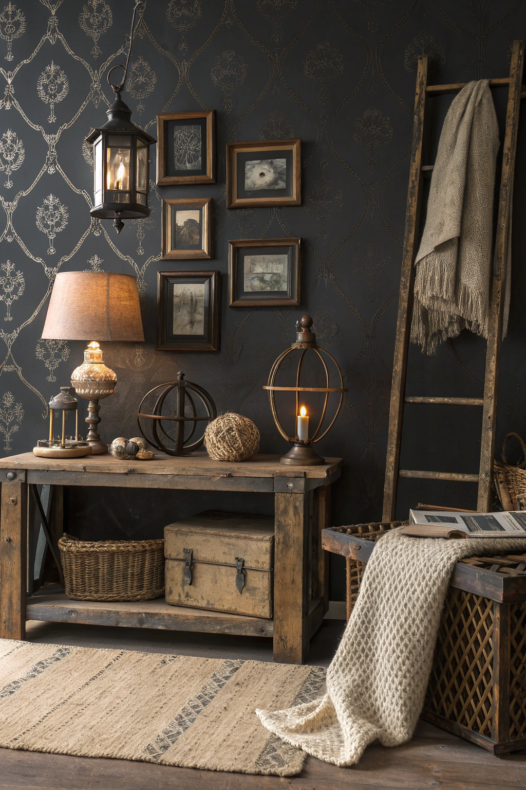 PinAdding rustic decor elements can beautifully complement the textured wallpaper in your dark room. Incorporate natural materials like weathered wood and metal fixtures to create a cozy atmosphere. Use antique accents, such as vintage lamps or old frames, that tell a story. Pair soft textiles like burlap or wool to enhance warmth and tactile appeal, making your space feel inviting and lived-in.