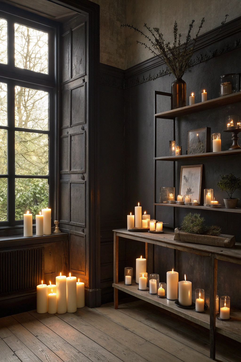 PinDark paint choices can create an enchanting backdrop, but adding ambient candles will enhance the room's atmosphere even further. Use various sizes and heights to create visual interest. Opt for scented candles to introduce delightful fragrances, adding another layer of warmth. Position them strategically on shelves, tables, or windowsills to cast soft shadows and create an intimate, inviting environment perfect for relaxation or conversation.