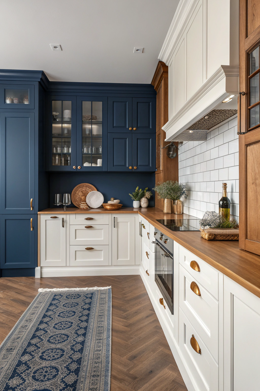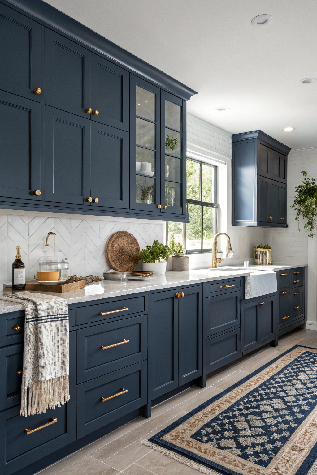 PinAfter enjoying the warmth of cozy caramel tones, you might want to explore the striking depth of timeless navy blue. This shade exudes sophistication and pairs beautifully with white cabinetry or warm wood accents. Whether you choose it for cabinetry, an accent wall, or accessories, navy blue creates a stunning and enduring backdrop that elevates your kitchen's overall aesthetic. Be bold and embrace this classic color!