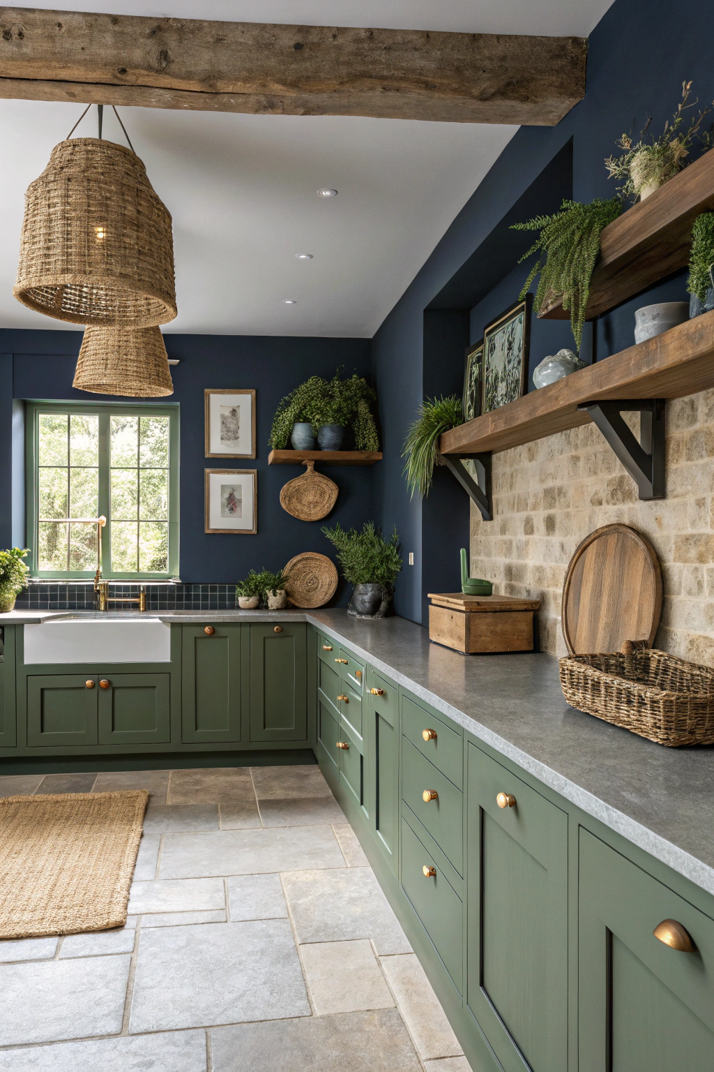 PinAfter the bold statement of dramatic dark blue, earthy olive green brings a grounded, organic vibe to your kitchen. This versatile color pairs beautifully with natural materials, like wood and stone, enhancing a warm atmosphere. You'll find it complements light fixtures and accents effortlessly, creating a cohesive look. Whether you choose it for cabinets or walls, olive green invites nature indoors.