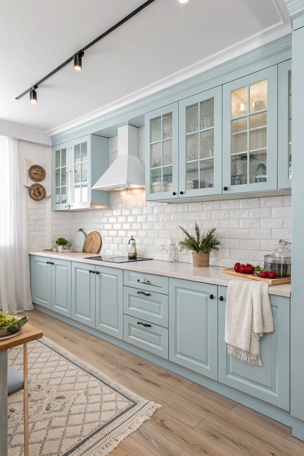 PinBathed in the calming hues of serene sky blue, your kitchen can become a tranquil retreat from the hustle and bustle of daily life. This soothing color pairs wonderfully with crisp whites and natural wood accents, creating a revitalizing ambiance. Consider these elements: