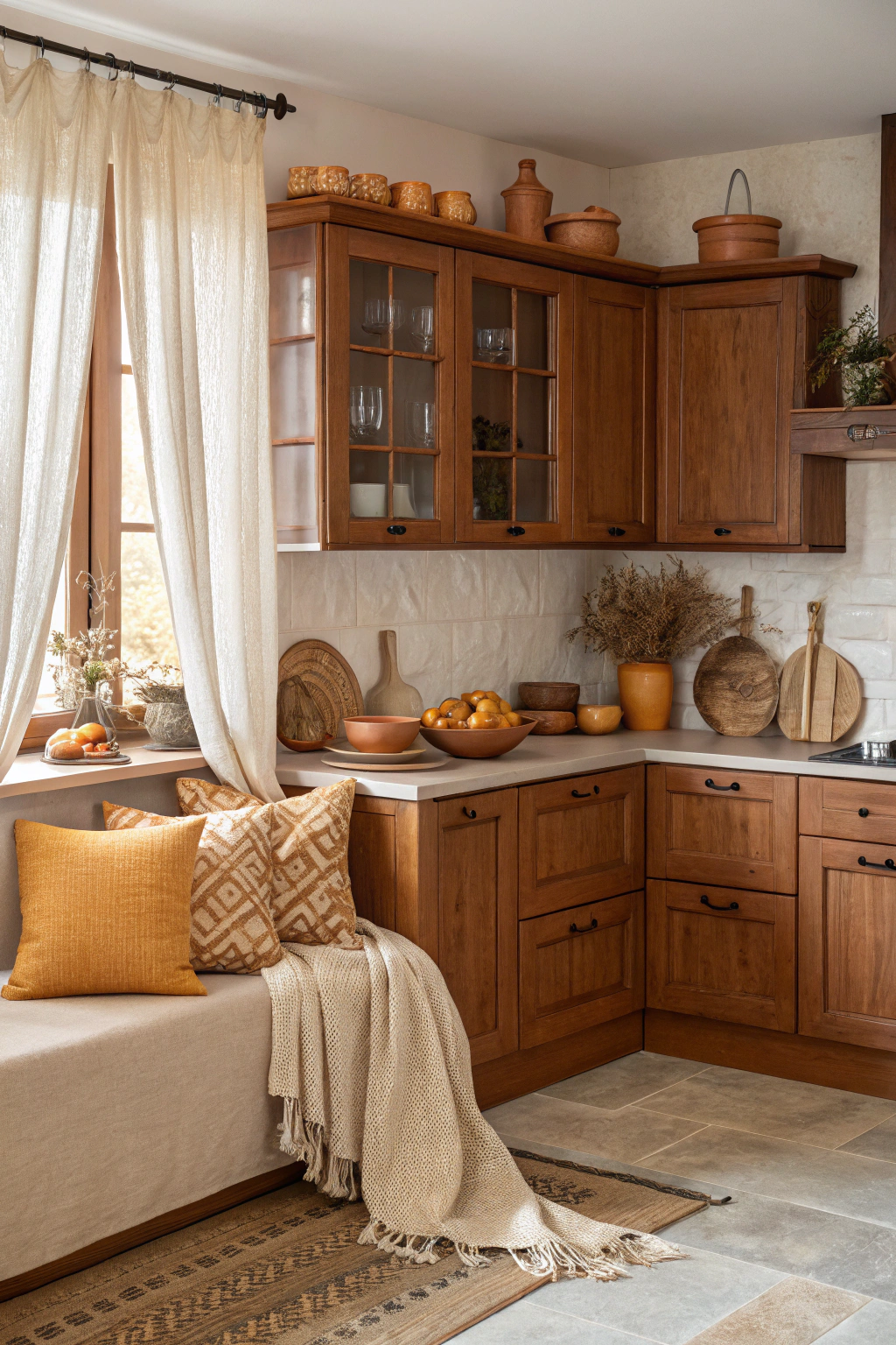- Warm wood cabinetry: Choose rich, caramel-stained cabinets for a natural feel.