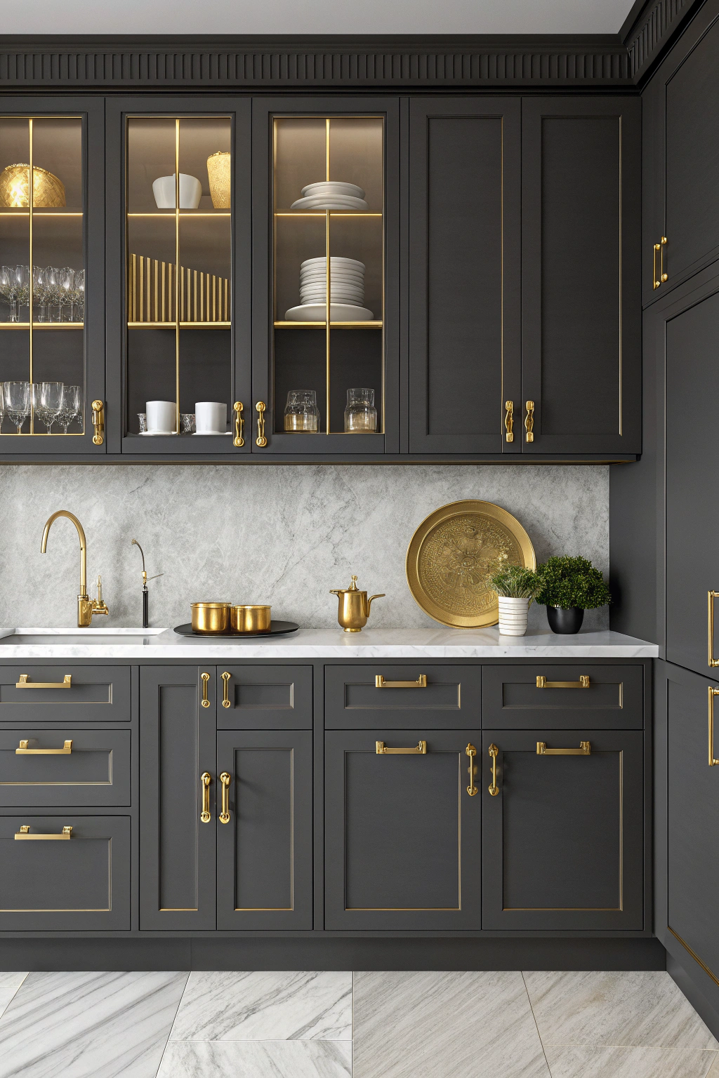 PinGraphite with gold is a striking combination that brings sophistication to your kitchen. This bold pairing creates a contemporary and luxurious look. To enhance the vibe, consider these ideas: