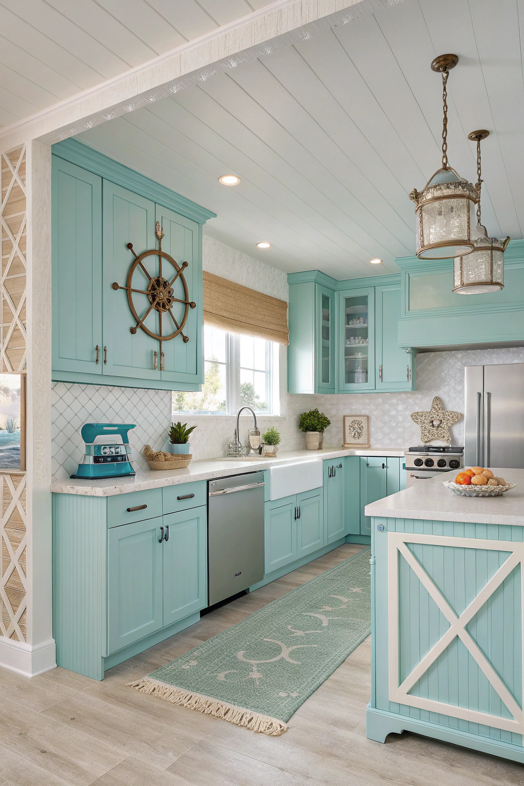 PinImagine stepping into a kitchen that radiates the calming essence of the ocean with beachy aqua vibes. You'll find soothing shades of turquoise and soft seafoam, creating a revitalizing atmosphere. Accent your cabinets with whitewashed wood or sandy beige tones, and add nautical decor to enhance the theme. This color palette invites relaxation and inspiration, making your kitchen the perfect coastal retreat.