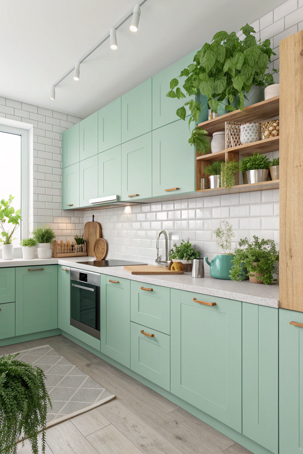 PinInvigorating freshness defines the charm of a mint-inspired kitchen. You'll love how this soothing color can enhance your cooking space. Mint cabinets, paired with white or light wood accents, create a revitalizing atmosphere. Add vibrant greenery or bright accessories to pop against the mint backdrop. Whether you prefer a subtle tint or a bold statement, mint transforms your kitchen into a lively haven.