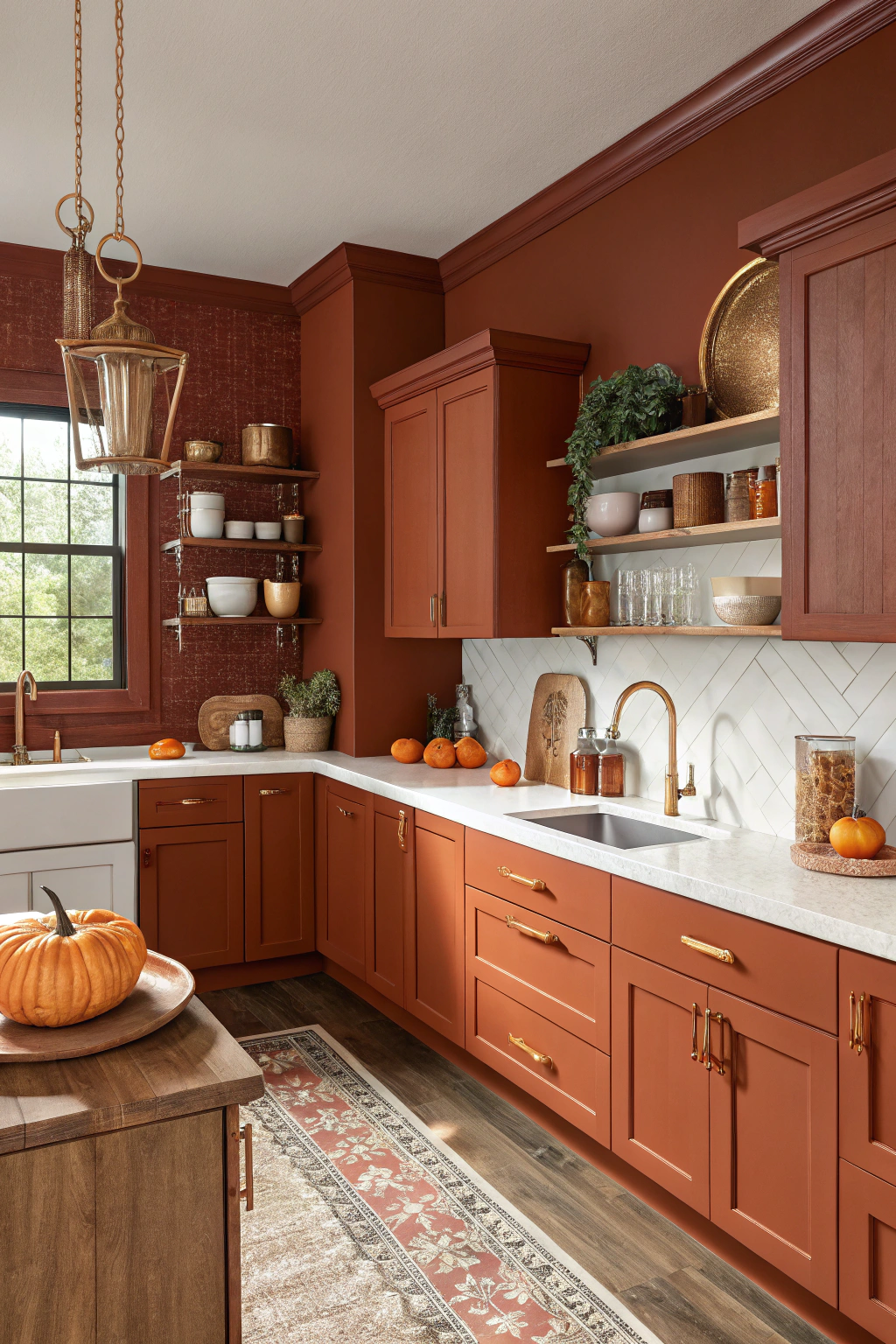 PinPicture a kitchen that's warm and inviting, bursting with the rich hues of pumpkin spice. You can infuse your space with this earthy color by painting cabinets or accent walls. Complement the warmth with natural wood elements and white countertops for balance. Add hints of copper or gold in your decor to enhance that cozy, autumn-inspired vibe. It's all about creating a playful yet harmonious atmosphere.