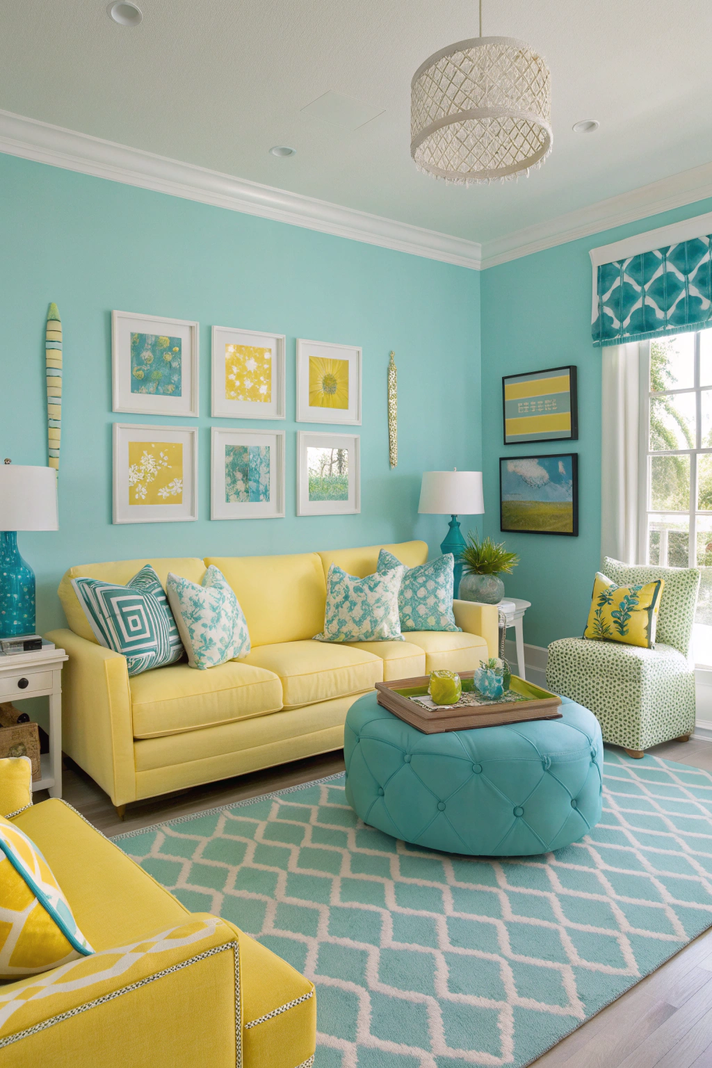 PinBright cyan and lemon create a vibrant and energizing atmosphere that can transform your living room into a lively retreat. This combination brightens up any space, making it feel inviting and cheerful. Use bright cyan for your walls or furniture, and complement it with lemon accents through cushions, artwork, or decor. This pairing encourages creativity and joy, making your living room the perfect gathering spot.