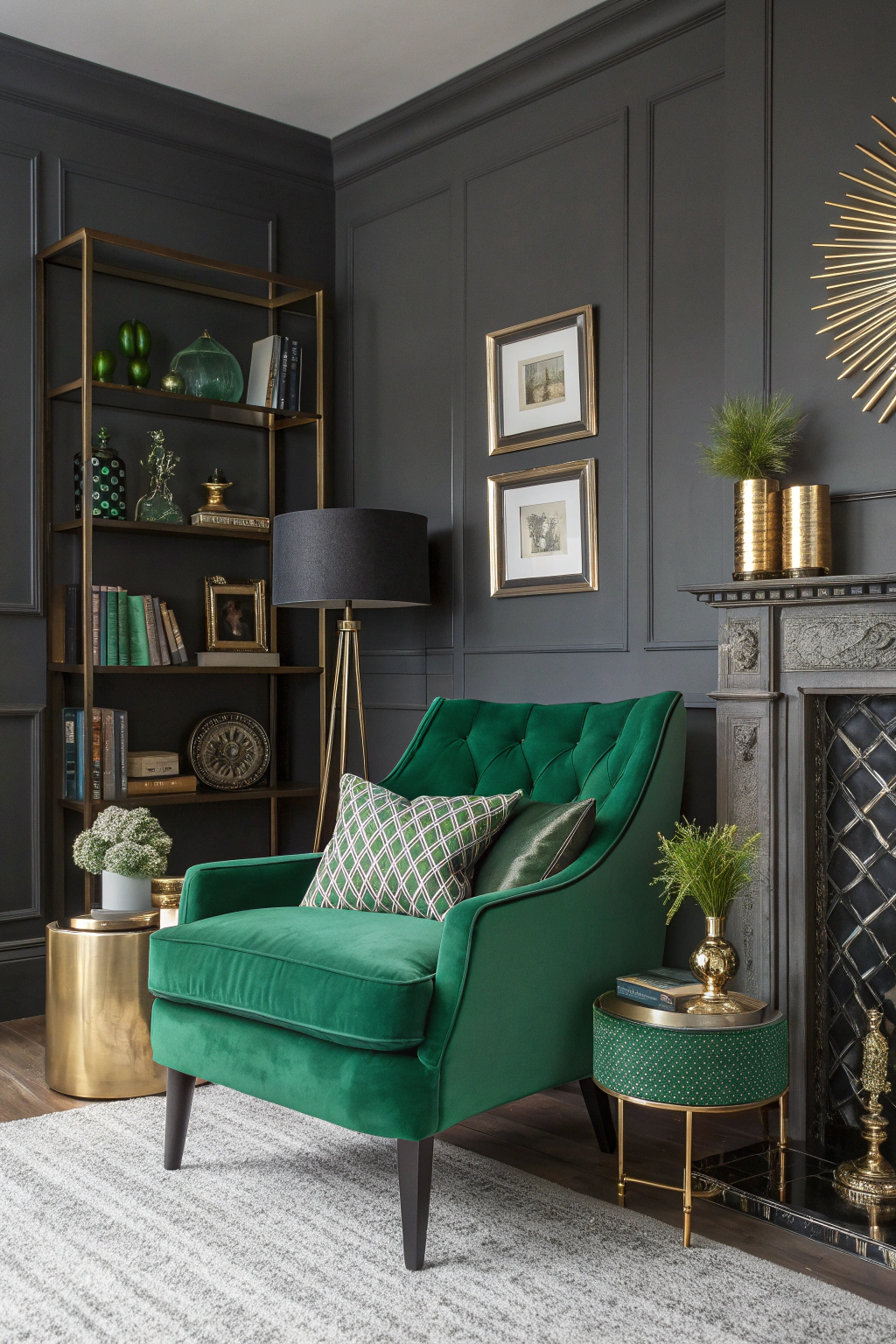 PinCharcoal and emerald green create a striking visual contrast that brings sophistication to your living room. Pair charcoal walls with emerald green furniture or accents, like cushions or a statement chair. This combination not only enhances the space's elegance but also adds depth. Use metallic elements, like gold or silver, to highlight the richness of the colors, making the room feel inviting and luxurious.