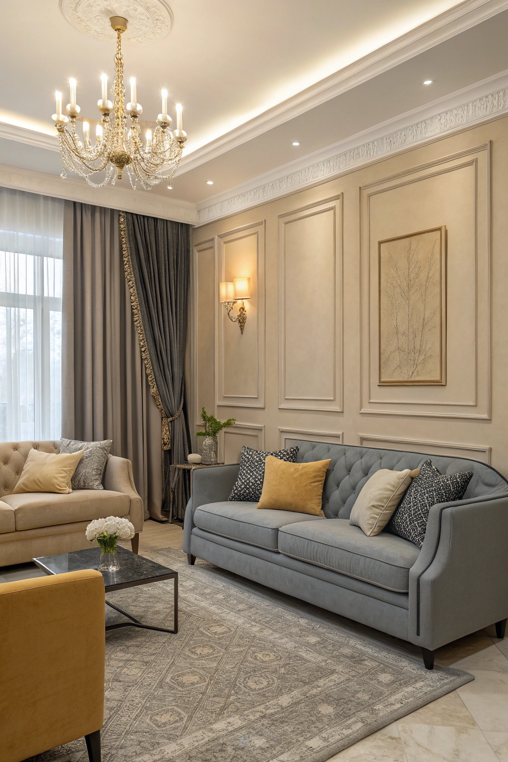 Together, these elements provide sophistication and a stylish foundation for your living room.