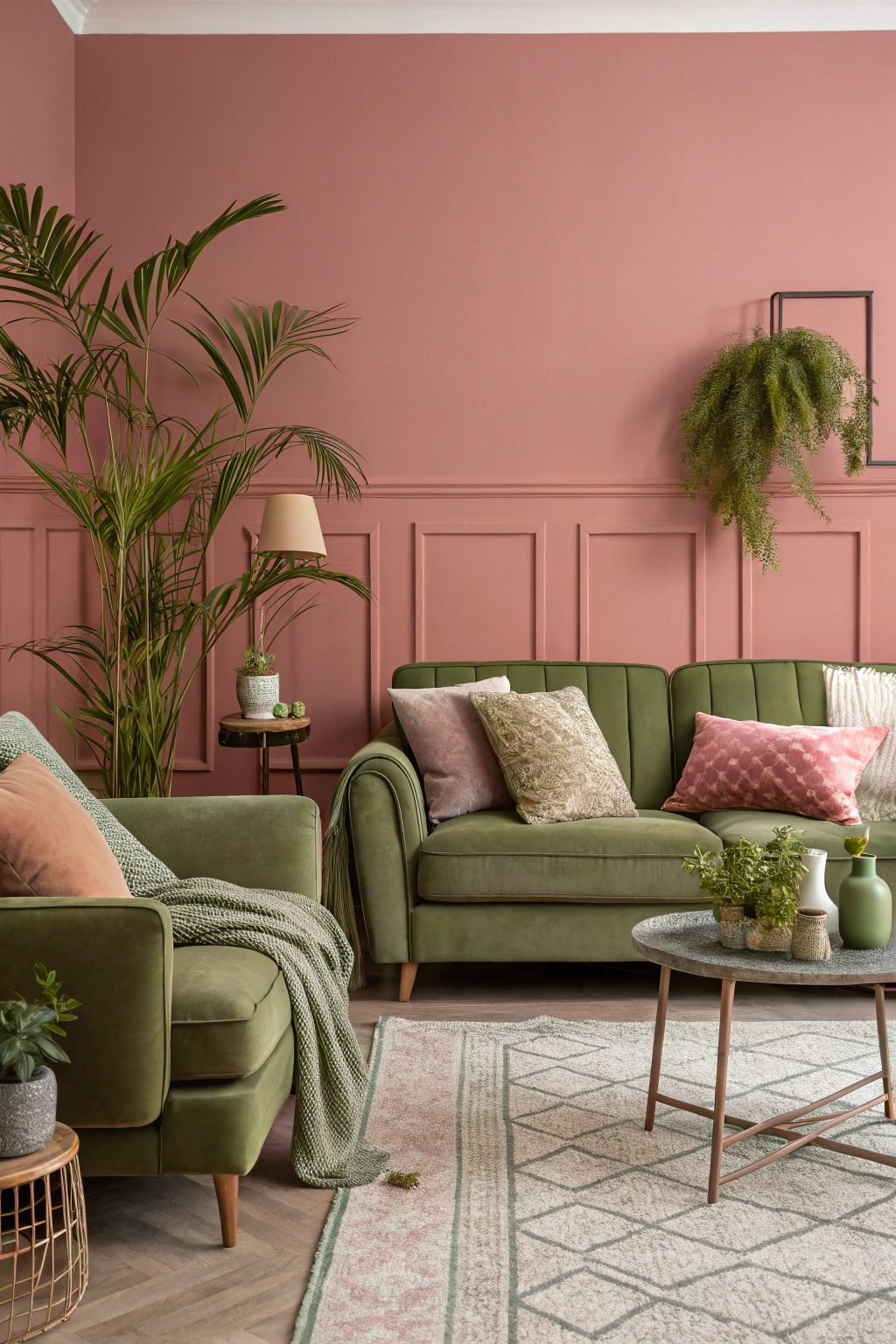 - Use olive green furniture with dusty rose accessories