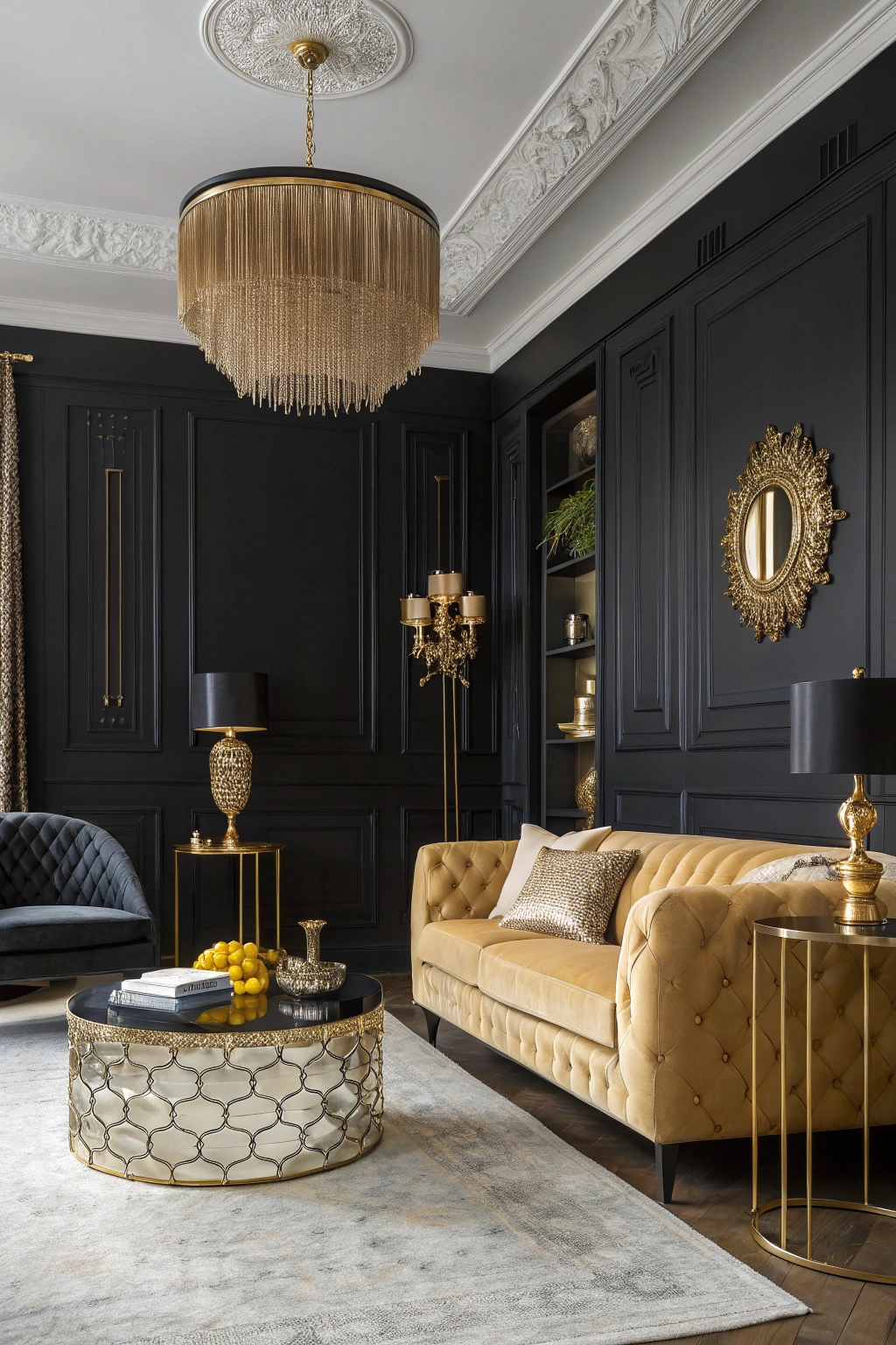 PinEmbracing the luxurious combination of black and gold can transform your living room into a sophisticated retreat. You can use black for your walls or furniture to create depth, while gold accents through decor, lighting, or textiles add a touch of elegance. This striking contrast elevates the overall ambiance, making your space feel both inviting and glamorous. Enjoy the bold, timeless appeal!