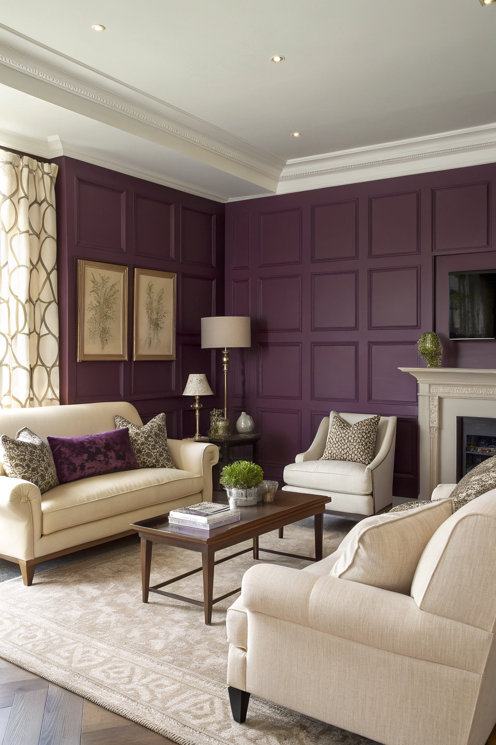 PinFor those looking to make a bold yet elegant statement in their living room, the combination of rich plum and soft cream is a fantastic choice. This pairing allows the deep, luxurious plum to command attention while the soft cream provides a soothing balance. Consider using plum for an accent wall and cream for furniture to create a harmonious and inviting space.