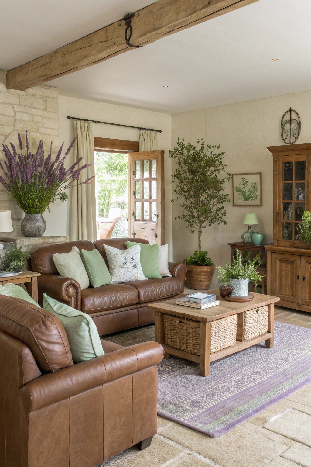 - Add sage green cushions and throws for comfort.