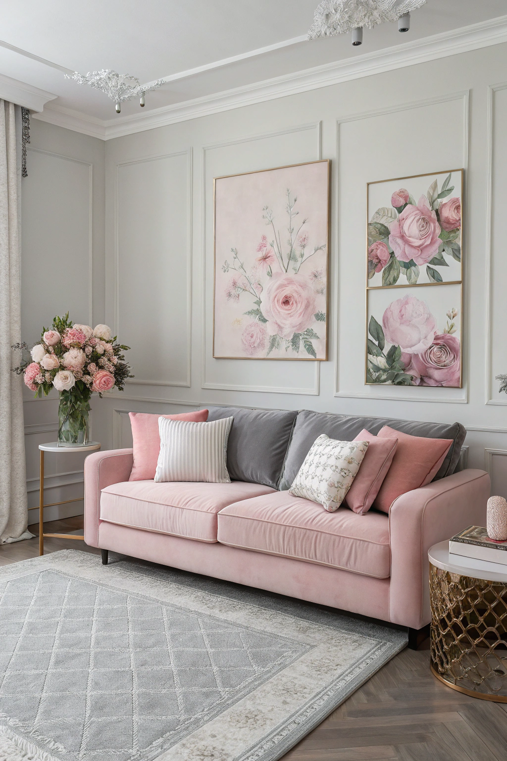 PinThree timeless elements come together beautifully in the combination of soft gray and blush pink. This soothing palette adds a touch of elegance to your living room. You can highlight it by:
