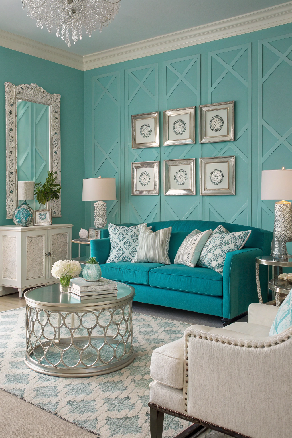 PinVibrant turquoise and silver create a lively contrast that infuses your living room with energy and elegance. You can incorporate turquoise through accent walls or furniture, while silver adds sophistication with decorative elements like lamps or frames. To enhance this combination, consider adding white or cream accents for balance. This dynamic duo will not only brighten up the space but also make it feel inviting.