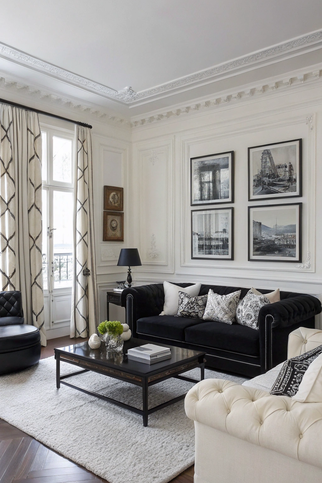- Bold black furniture against white walls