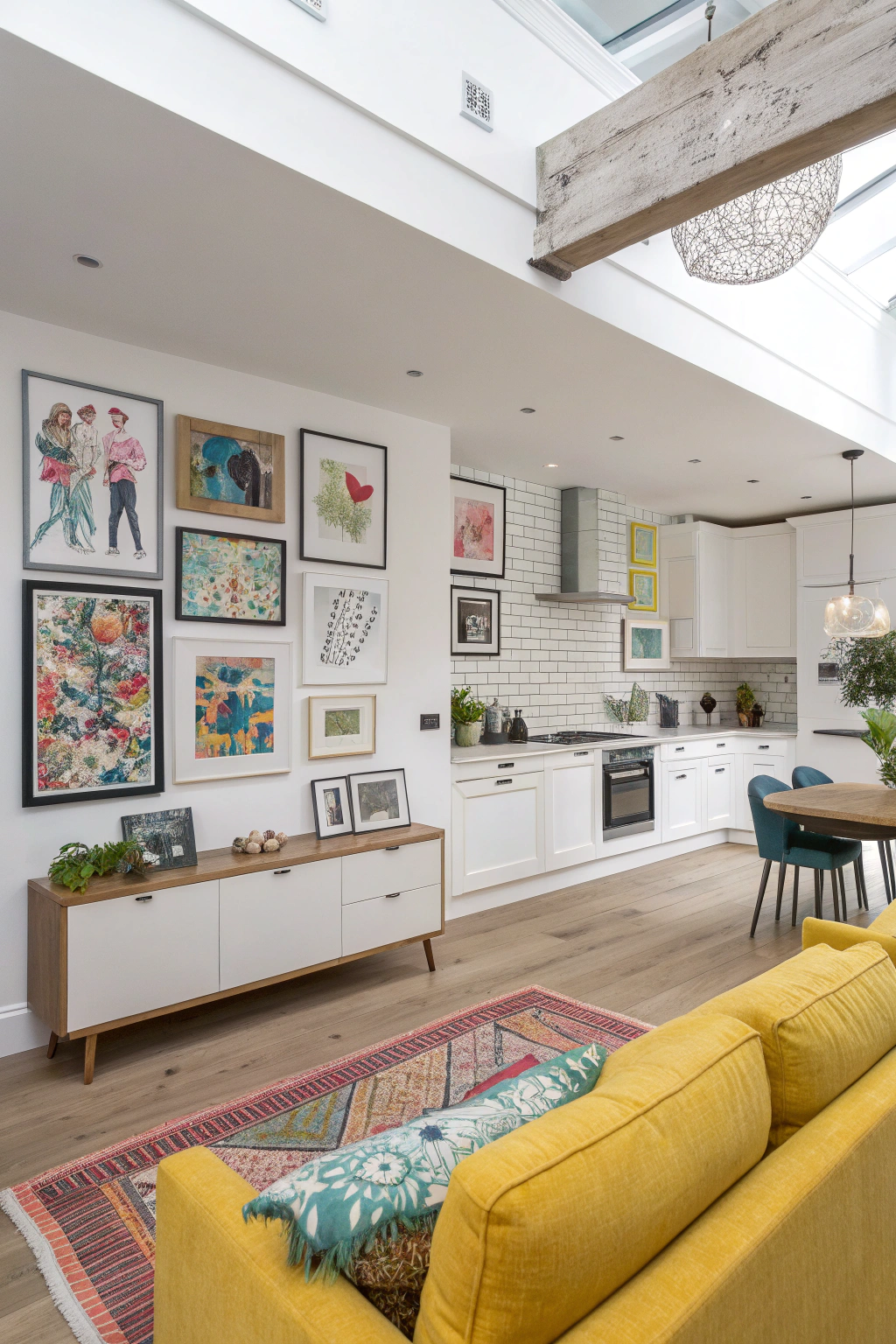 PinBold artwork displays can transform your open plan kitchen living room into a vibrant focal point. You can energize your space by choosing pieces that reflect your personality. Consider these three suggestions: