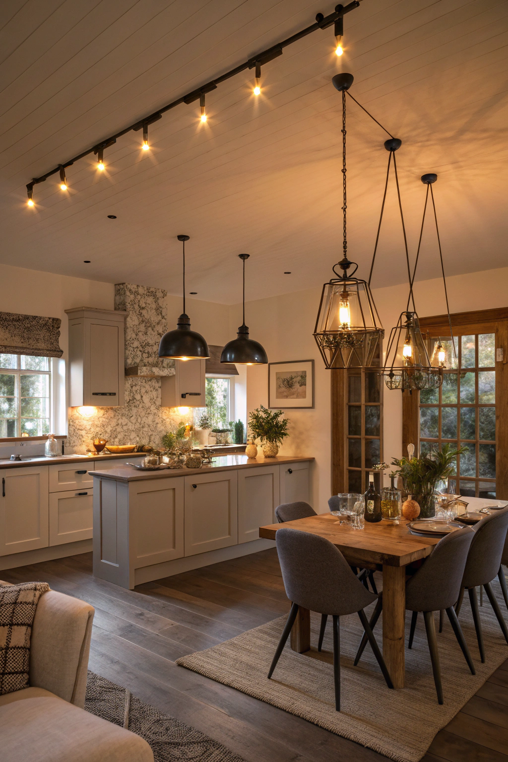PinCreating a cozy atmosphere in your open plan kitchen living room is all about warm ambient lighting. Use soft, adjustable fixtures like pendant lights or wall sconces to set the mood. Incorporate dimmers so you can easily change the brightness based on the time of day. Table lamps and string lights can also add warmth, enhancing intimacy in this shared space.