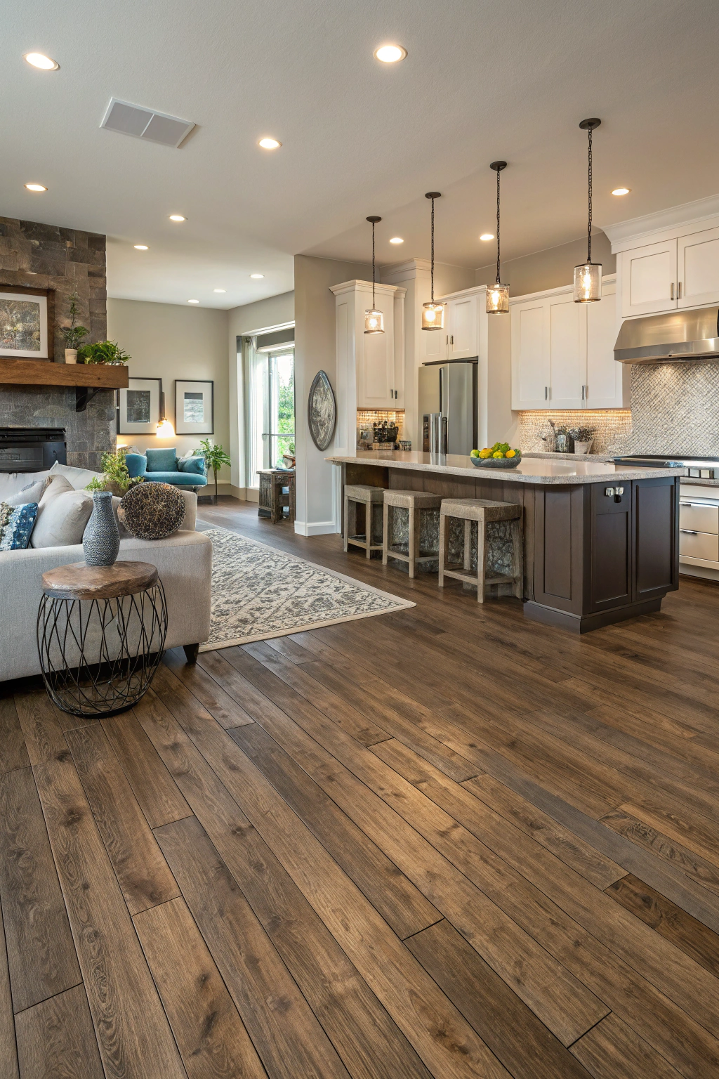 PinCreating a seamless flow between your open plan kitchen and living room starts with choosing the right blended flooring options. Consider materials like hardwood, laminate, or luxury vinyl that complement each other. Mixing textures can add depth, so try pairing wide planks in the kitchen with smaller tiles in the living area. This cohesive design ties spaces together while ensuring functionality in high-traffic areas.